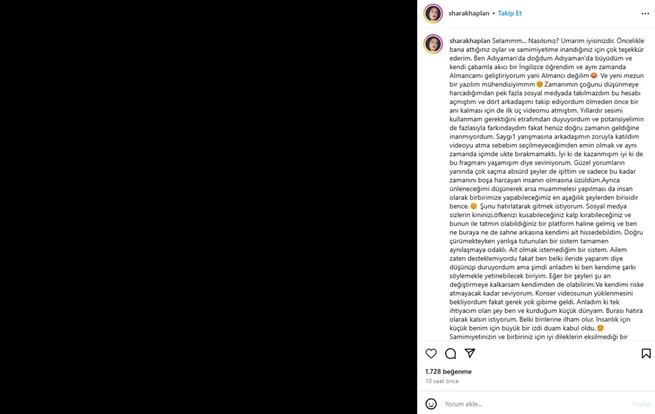 Şunu hatırlatarak gitmek istiyorum. Sosyal medya sizlerin kininizi, öfkenizi kusabileceğiniz kalp kırabileceğiniz ve bunun ile tatmin olabildiğiniz bir platform haline gelmiş ve ben ne buraya ne de sahne arkasına kendimi ait hissedebildim. Doğru çürümekteyken yanlışa tutunulan bir sistem tamamen aynılaşmaya odaklı. Ait olmak istemediğim bir sistem. Ailem zaten desteklemiyordu fakat ben belki ileride yaparım diye düşünüp duruyordum ama şimdi anladım ki ben kendime şarkı söylemekle yetinebilecek biriyim.