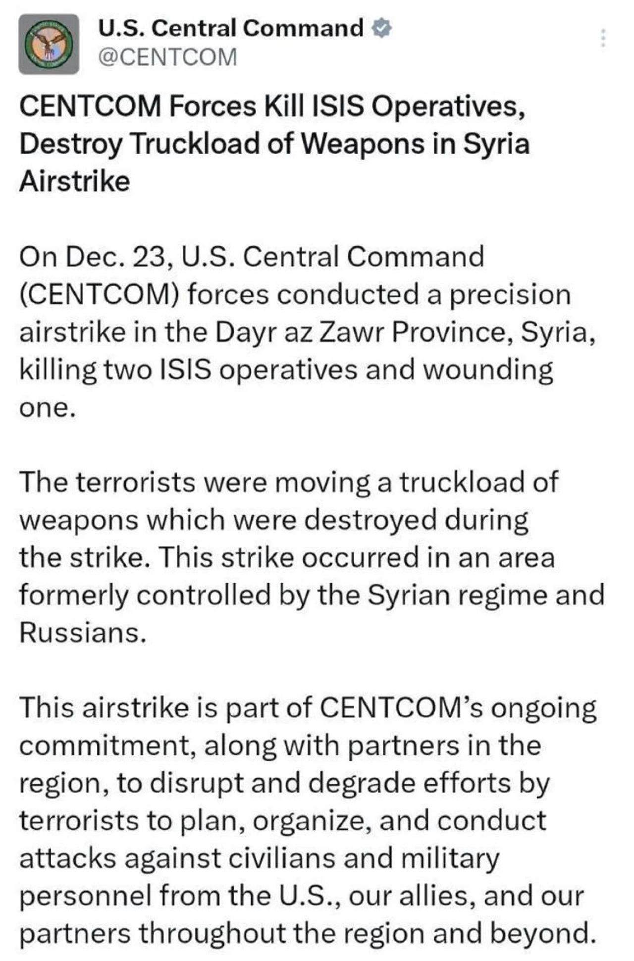 ABD Merkez Kuvvetler Komutanlığı (CENTCOM), Suriye'nin Deyrizor bölgesinde bulunan bir DEAŞ hedefine yönelik hassas hava saldırısı gerçekleştirildiğini duyurdu. CENTCOM’dan yapılan açıklamada, daha önce Suriye rejimi ve Rusya tarafından kontrol edilen bir bölgede gerçekleşen saldırıda 2 DEAŞ’lı teröristin öldürüldüğü, 1’inin ise yaralandığı belirtildi.