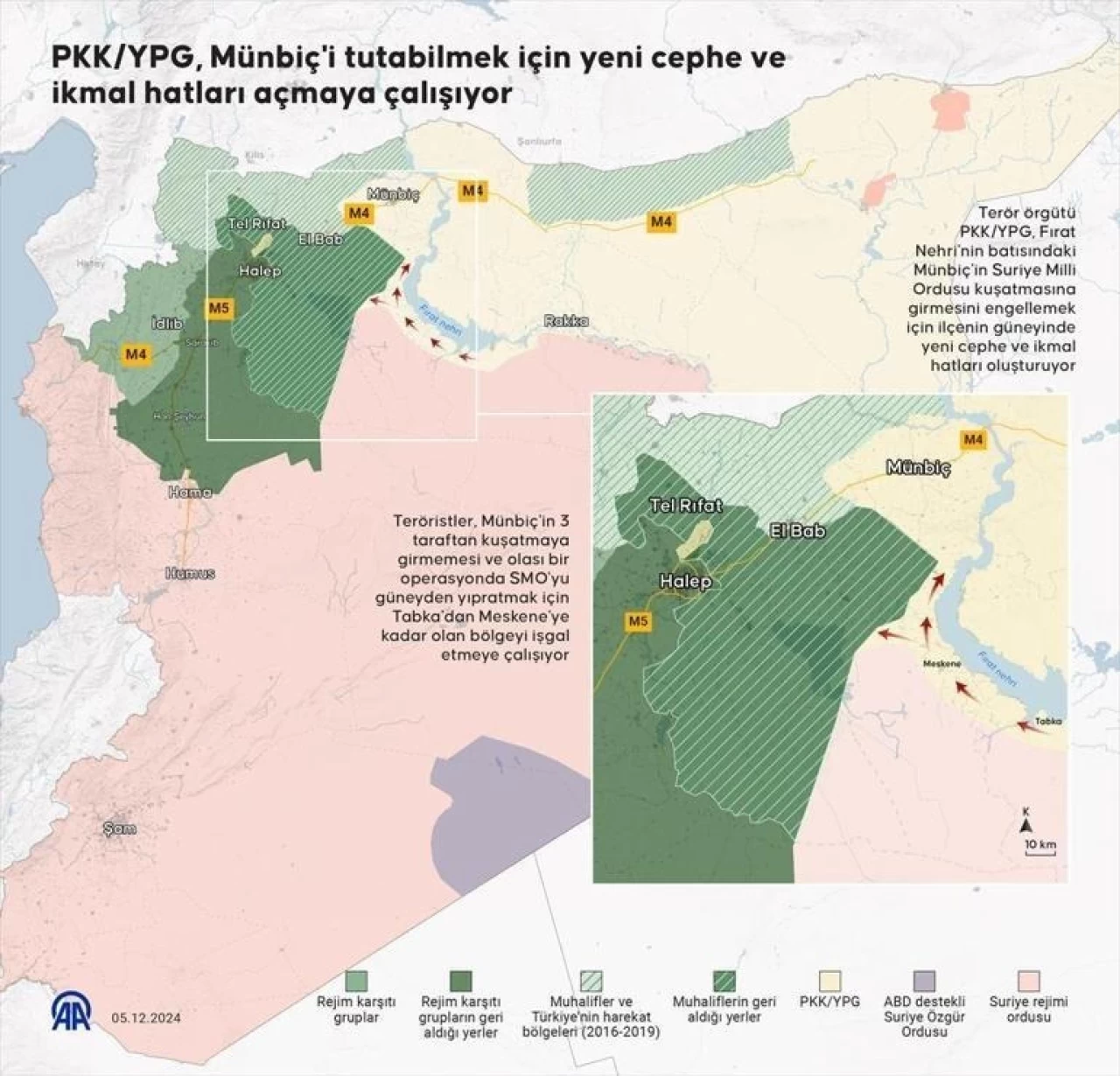 Suriye'nin kuzeyindeki Halep ilinin batı kırsalında 27 Kasım'da Esad rejimi güçleriyle, rejim karşıtı silahlı gruplar arasında çatışma başlamıştı. 30 Kasım'da Halep'in merkezinin büyük bölümünü rejim güçlerinden alan rejim karşıtı gruplar, aynı gün tüm İdlib genelinde hakimiyet sağlamıştı. Gruplar, şiddetli çatışmaların ardından 5 Aralık'ta Hama kent merkezini rejim güçlerinden almıştı. Rejim karşıtı gruplar, başkent Şam'a açılan stratejik önemdeki Humus ilinin bazı yerleşim yerlerini ele geçirerek burada ilerlemeye başlamıştı. Suriye Milli Ordusunun Halep kırsalında 1 Aralık'ta terör örgütü PKK/YPG'ye karşı başlattığı Özgürlük Şafağı Operasyonu'nda ise Tel Rıfat ilçe merkezi, terörden kurtarılmıştı.