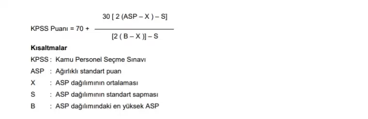 Adayların ASP’leri kullanılarak KPSS puanları hesaplanacaktır. KPSS puanlarının hesaplanmasında aşağıdaki formül kullanılacaktır. Böylece her KPSS puan türü için 100 üzerinden KPSS puan dağılımı elde edilmiş olacaktır. Kamu kurum ve kuruluşları, adayları, A Grubu Kadrolar için giriş sınavlarına KPSS puanlarına göre çağıracaklar, giriş sınavı yapmayacak olan kamu kurum ve kuruluşları atamalarda doğrudan KPSS puanlarını kullanacaklardır.