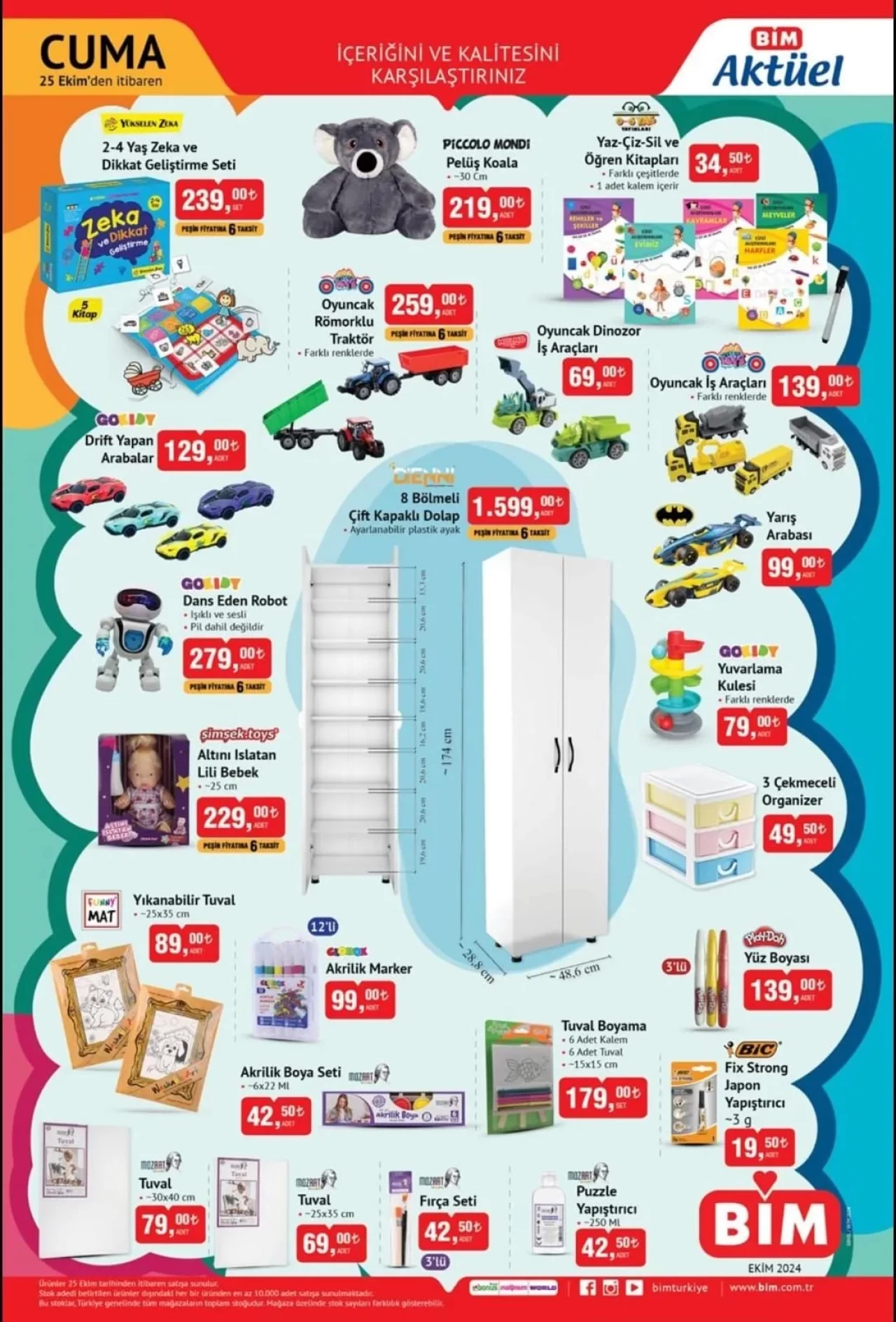 25 Ekim aktüel ürünlerde yine çocukları es geçmemiş. Pek çok oyuncağın bulunduğu aktüel ürünlerde bu hafta, peluş ayıcık, dikkat geliştirme oyunları, çeşitli oyuncak arabalar yer alacak.