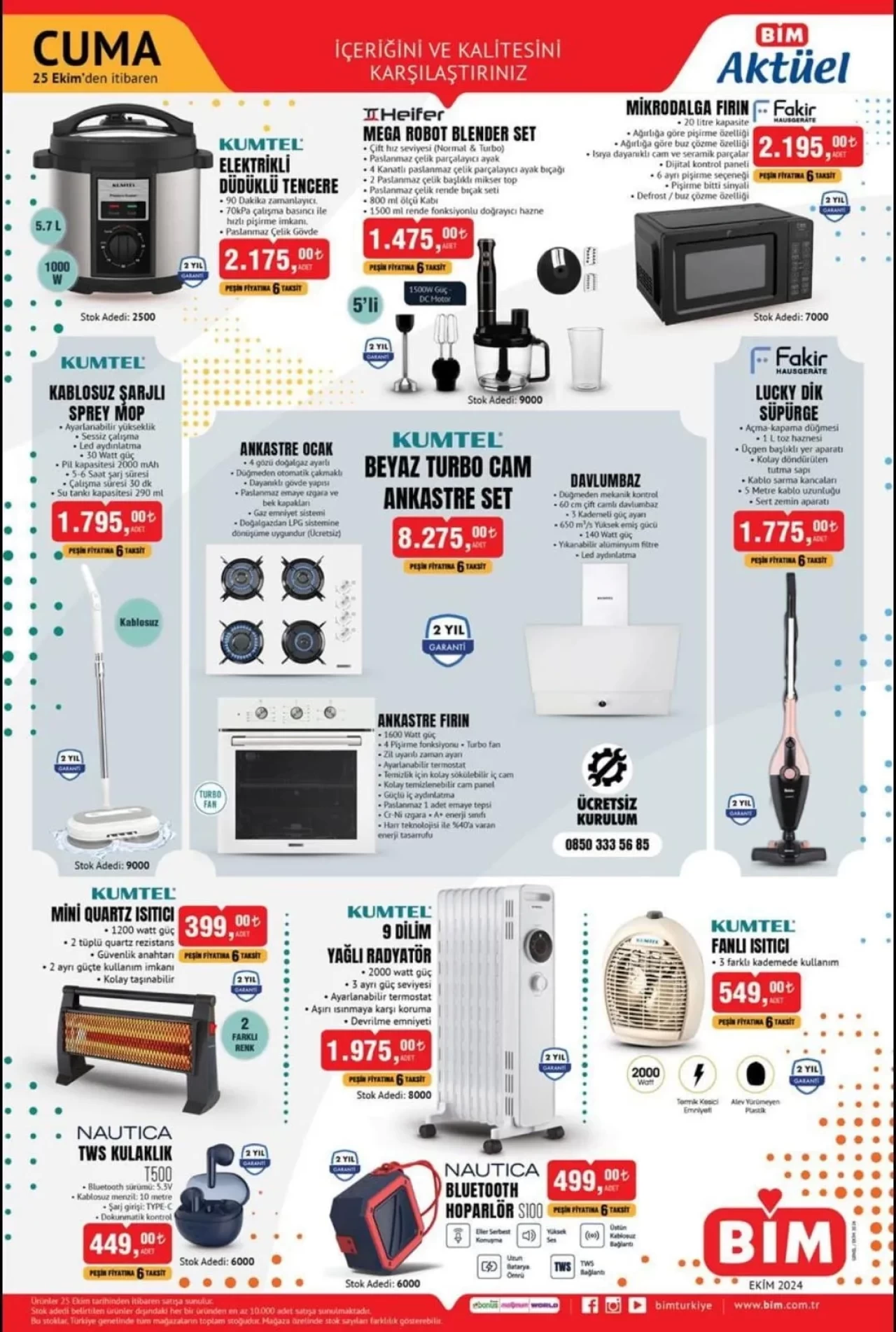25 Ekim BİM aktülde elektronik ürünlerde de kaçırılmayacak fırsatlar bulunuyor. Düdüklü tencere 2.175 TL'den, blender seti 1.475 TL'den, ankastre set ise 8275 TL'den satılacak.