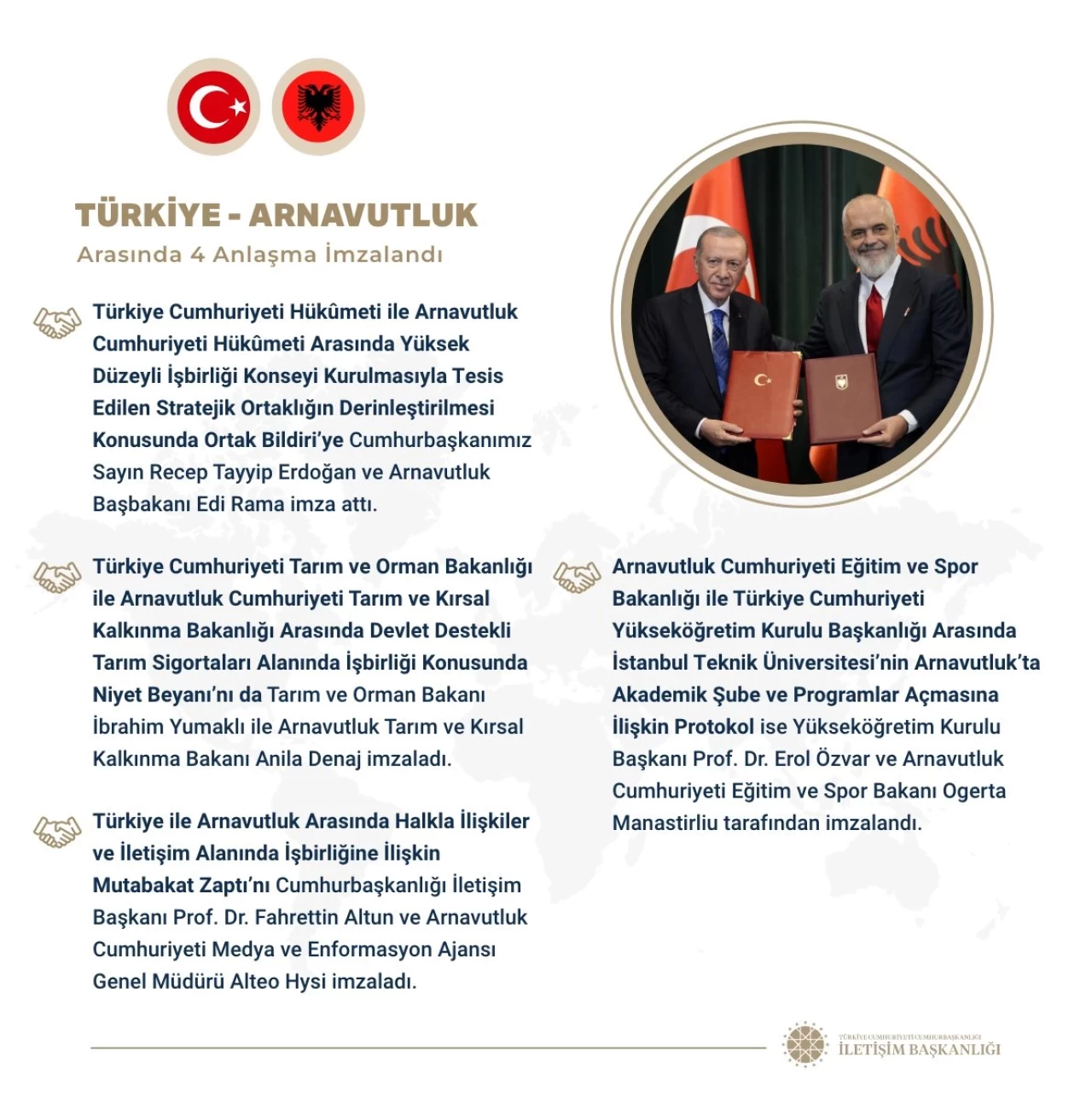 Cumhurbaşkanlığı İletişim Başkanlığı sosyal medya hesabından yapılan paylaşımda, Türkiye ile Arnavutluk arasında 4 antlaşma imzalandığı bildirildi. İmzalanan antlaşma maddeleri şu şekilde;
