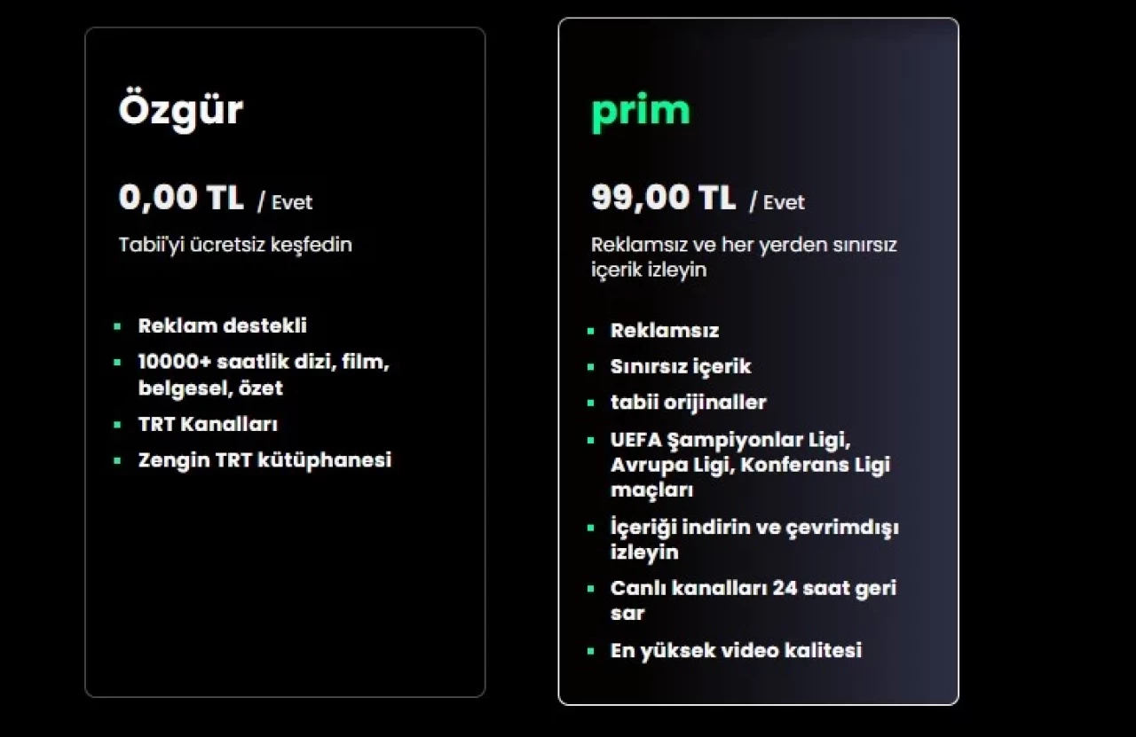 Tabii Özgür'de ise reklamlı izleme seçeneği mevcut. Öte yandan Pek çok dizi ve film seçeneği bulunuyor.