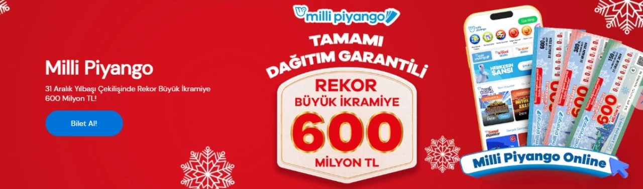 Yılbaşı biletleri, bayilerde ve Milli Piyango Online’da satılıyor. Milli Piyango yılbaşı özel çekilişinde 600 milyon TL’lik büyük ikramiyenin tamamı geçtiğimiz yıl olduğu gibi bu yıl da dağıtım garantili olacak. Belirlenen kuralla birlikte bilet payına bakılmaksızın, büyük ikramiye, isabet ettiği satılan bilet ya da biletler arasında eşit olarak paylaştırılacak.