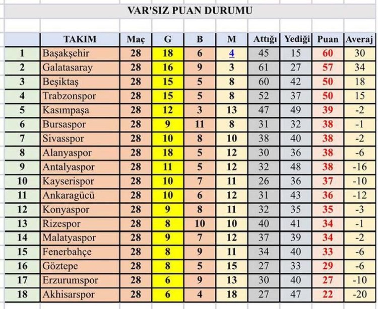 İşte Süper Lig'de 29. hafta sonunda VAR'sız puan durumu...
