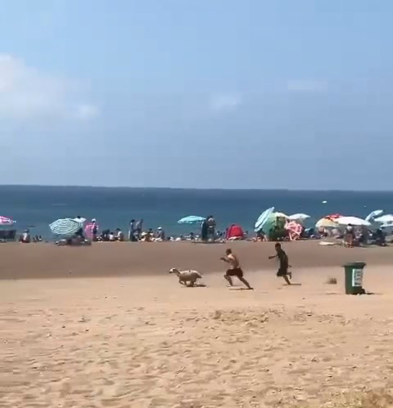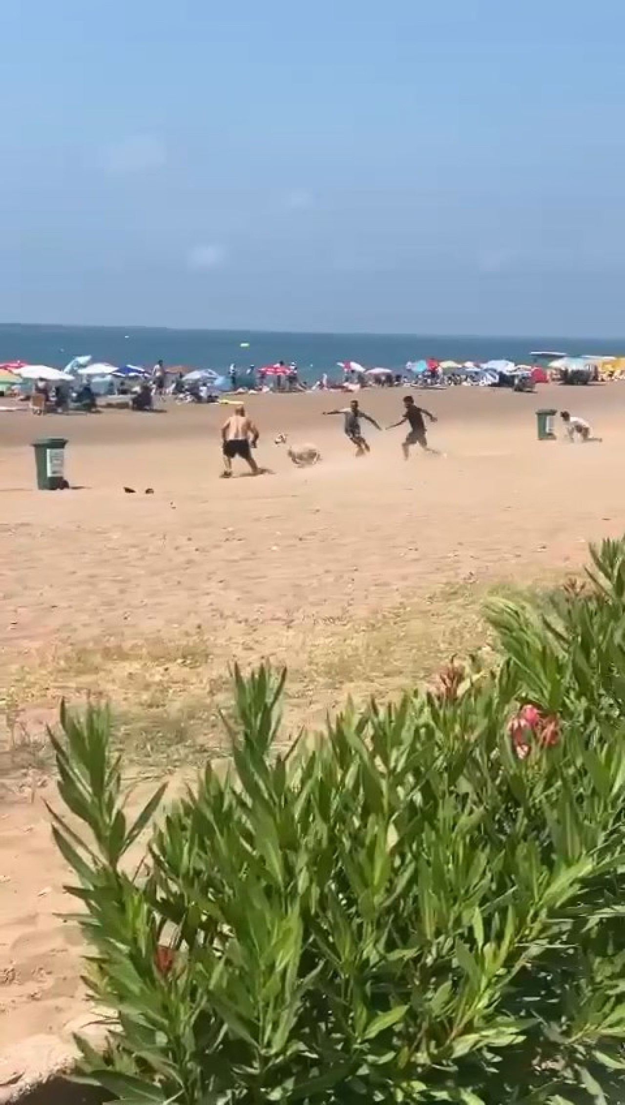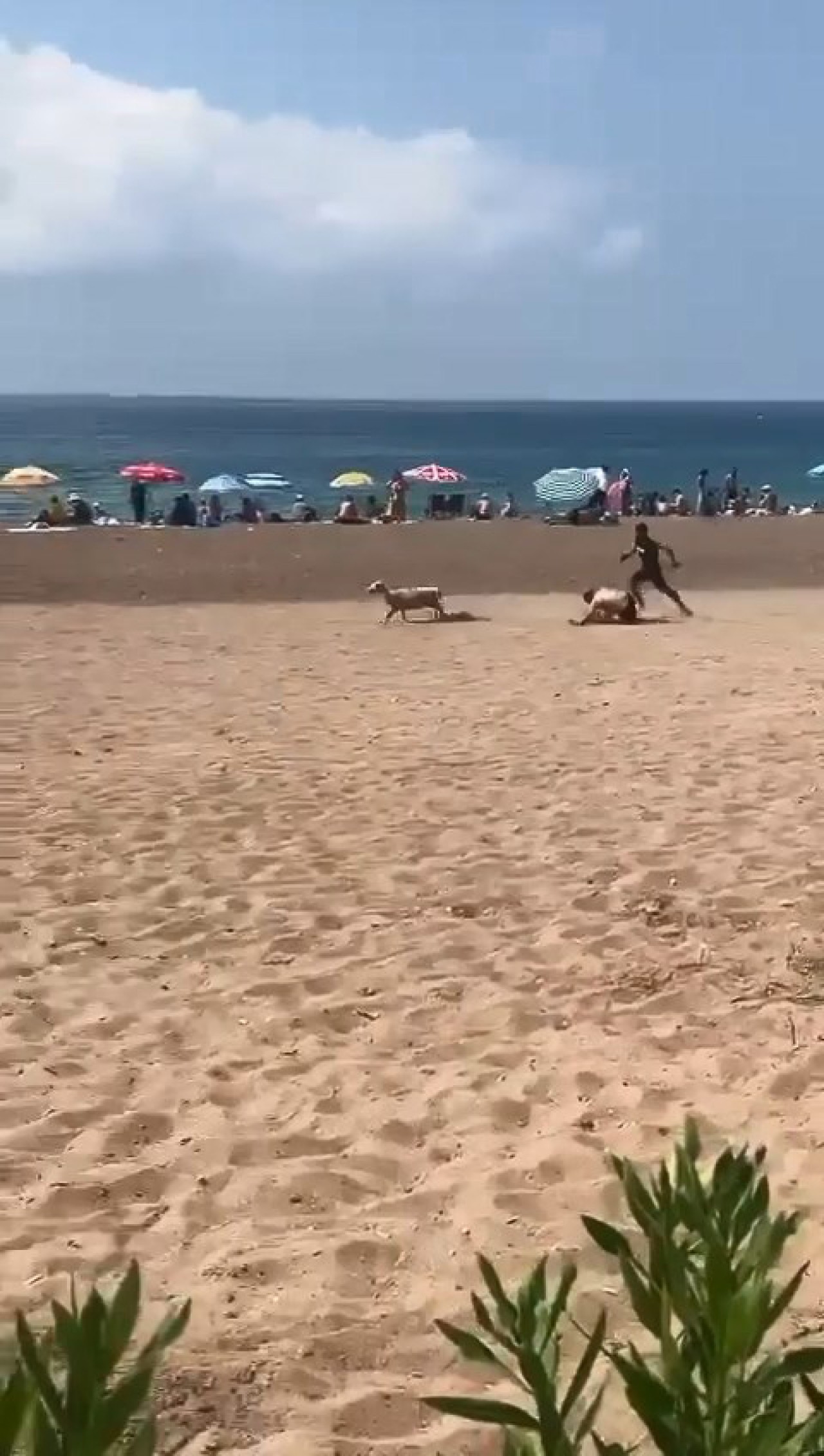 Cep telefonu kamerasıyla kaydedilen görüntülerde sahilde denize girenlerin arkasında koşan kurbanlığı yakalamaya çalışanlar olduğu, bunlardan birinin ise düştüğü görüldü.