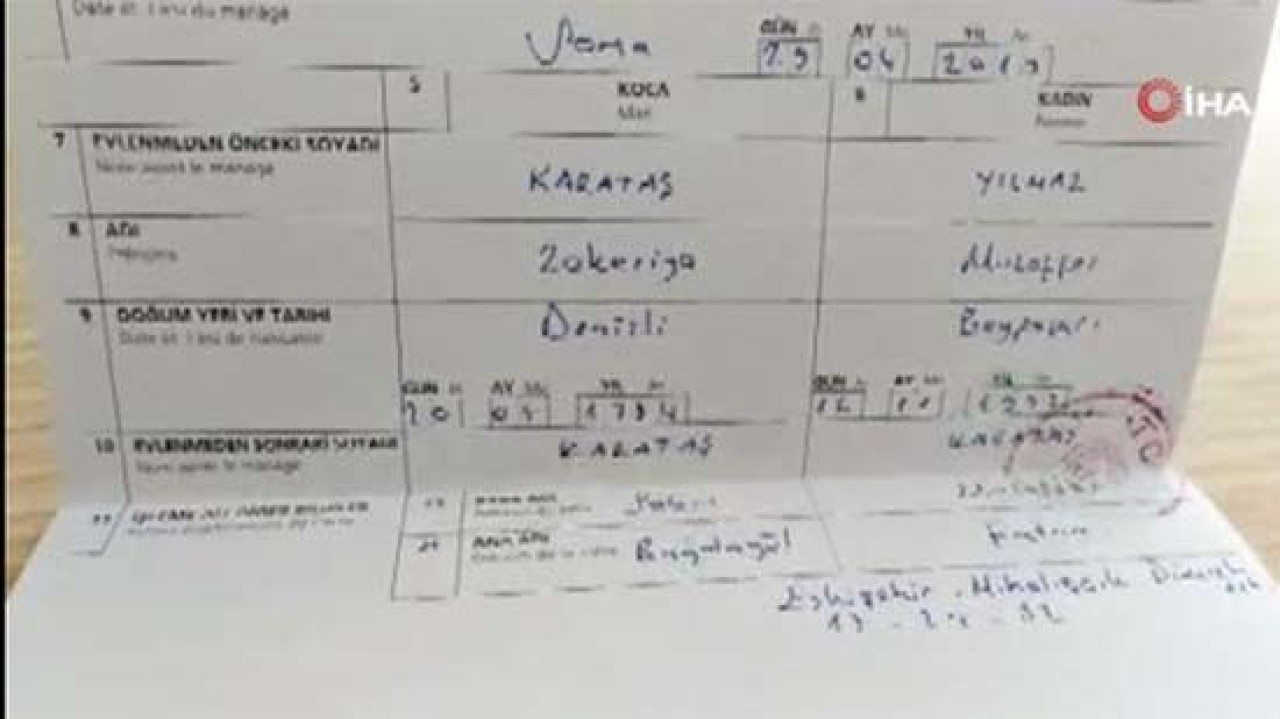 Denizli’de yaşayan Zekeriya Karataş (35) önceki gün nişanlısı Gülşah Yılmaz (25) ile evlenmek için Soma Belediyesi Nikah Dairesi'ne gitti. Aile içinde yapılan sade bir törenle çift dünya evine girdi. Hayli neşeli bir ortamda geçen nikah sonrası evlerine giden çift ise aile cüzdanlarına bakınca hayatlarının şokunu yaşadı. Damat Zekeriya Karataş, aile cüzdanındaki bilgiler kısmında eşinin adının yazıldığı yerde kayınpederi olan Muzaffer Yılmaz’ın (56) isminin yazılı olduğunu görünce gözlerine inanamadı. Ardından durumu anlamlandıramayan çift yaşadıklarını aile üyeleri ile paylaştı. Çift yanlışlığın düzeltilmesi için tekrar nikah dairesinin yolunu tuttu.