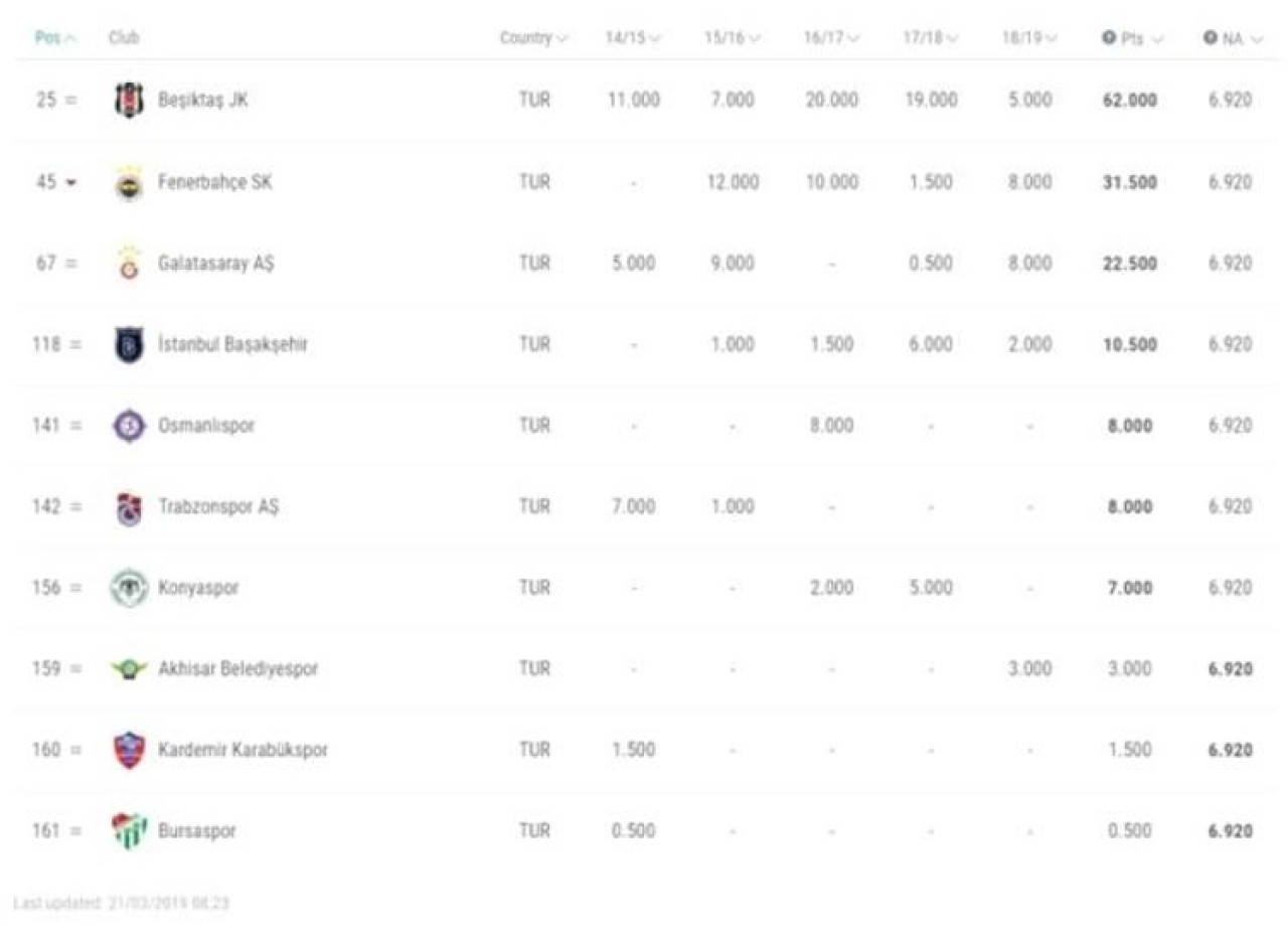 u003cbu003eTÜRKİYE'NİN EN İYİSİ BEŞİKTAŞ u003c/bu003eListenin en tepesinde ise Beşiktaş var. Son yıllarda Avrupa'da aldığı sonuçlarla önemli puanlar elde eden siyah beyazlılar 62.000 puanla Türkiye'nin en fazla puan toplayan takımı durumunda.