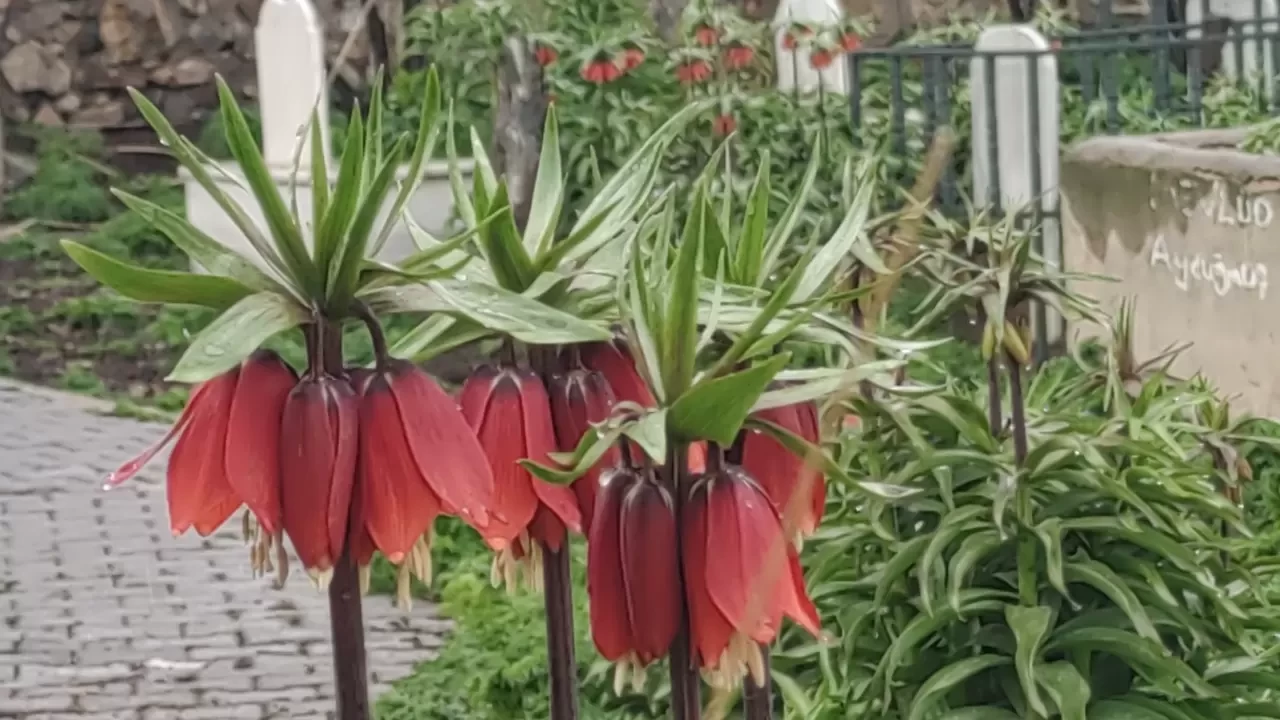 Mezarlık, dağ ve vadilerde yetişen ve eşsiz güzelliğiyle mest eden ters laleler kartpostallık görüntüler oluşturuyor.