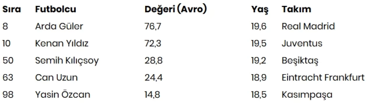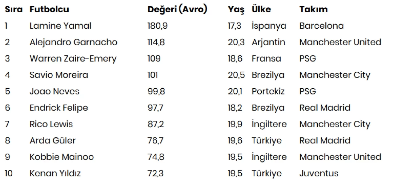 Real Madrid forması giyen Arda Güler, 76,7 milyon avroluk değeriyle listede 8. sırada bulunurken Juventus'tan Kenan Yıldız ise 72,3 milyon avroluk değeriyle 10. sırada yer aldı.