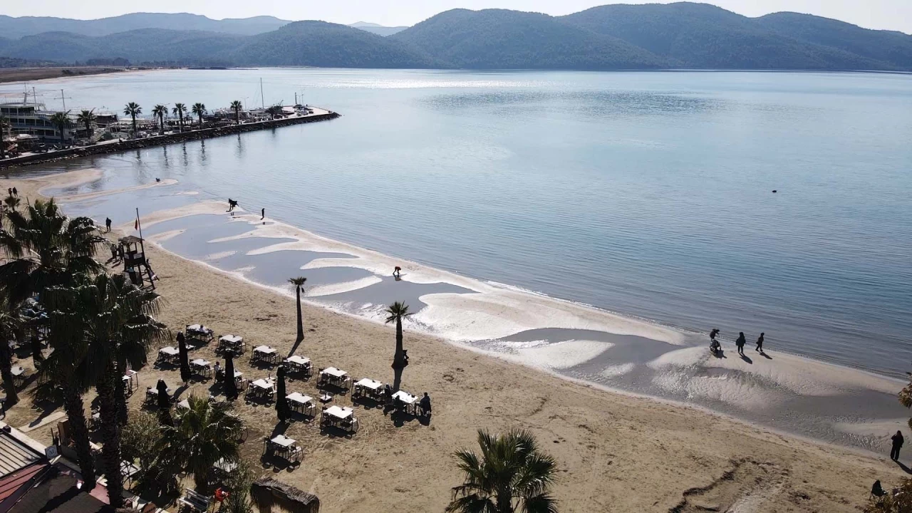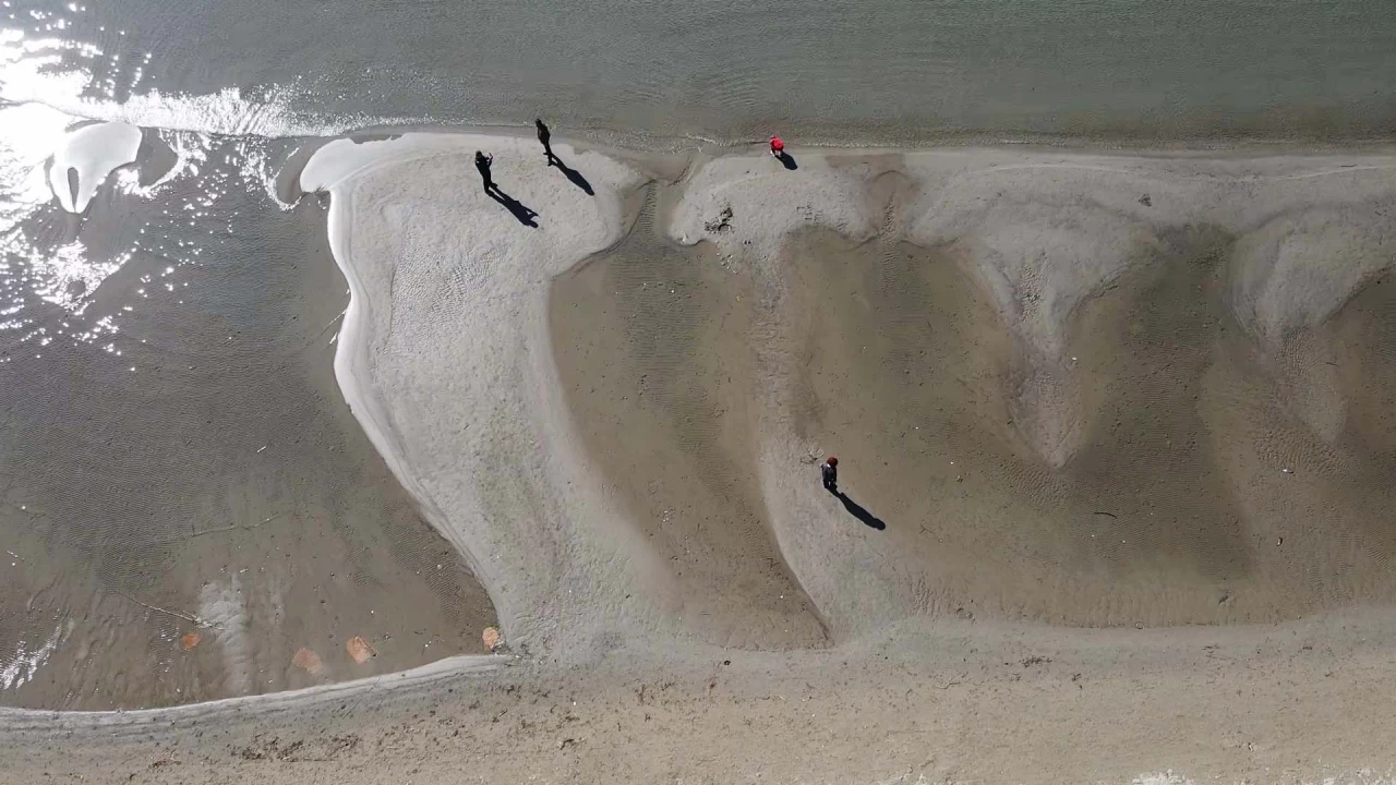 Akyaka sahilinde oluşan kum adacıkları ve suyun çekildiği alan, dronlar aracılığıyla görüntülendi. Bu olağanüstü doğa olayı, bölgede meraklı bakışlarla izlendi.