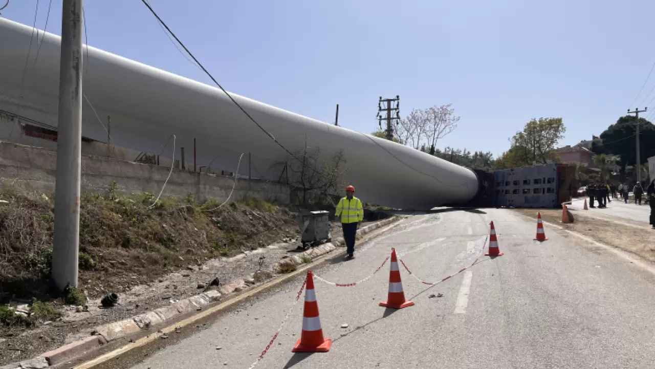 İlçeye bağlı Umurbey beldesinde rüzgar türbini pervanesi taşıyan ve sürücüsü öğrenilemeyen tır, manevra esnasında devrildi.
