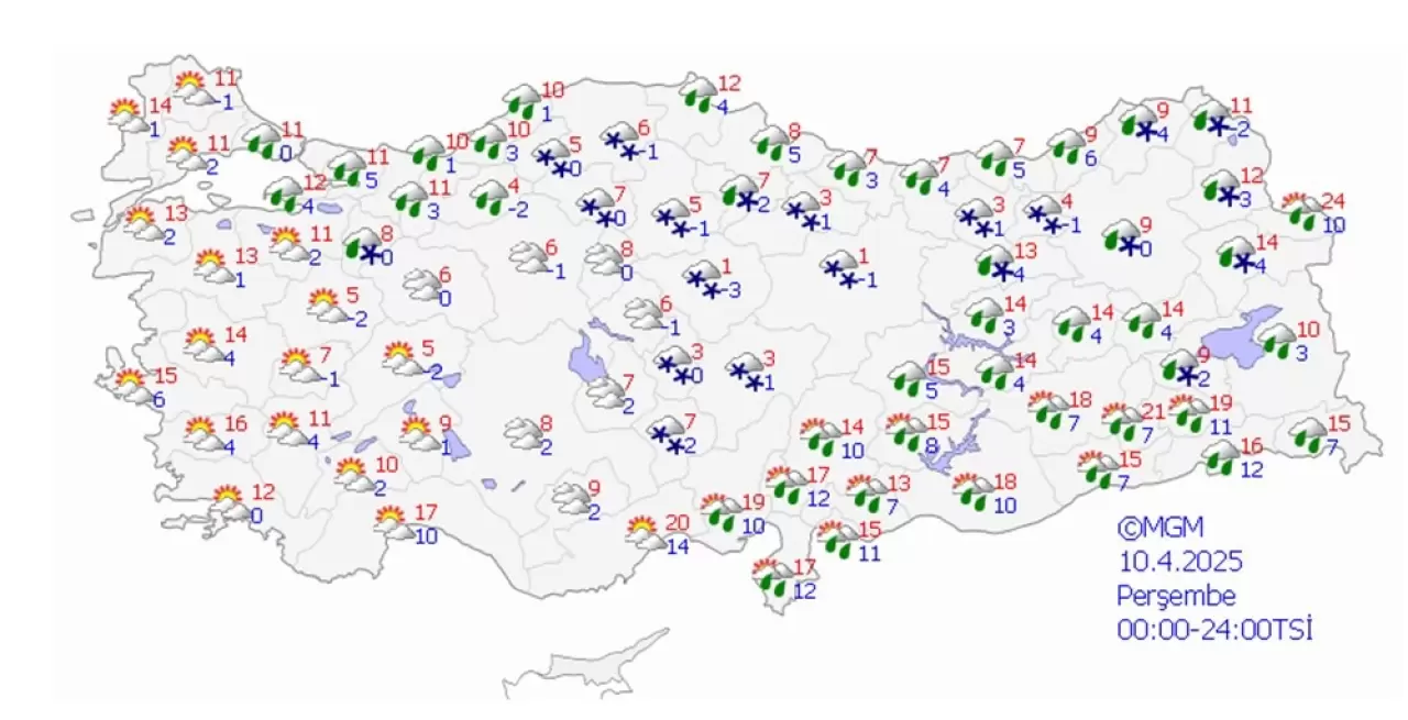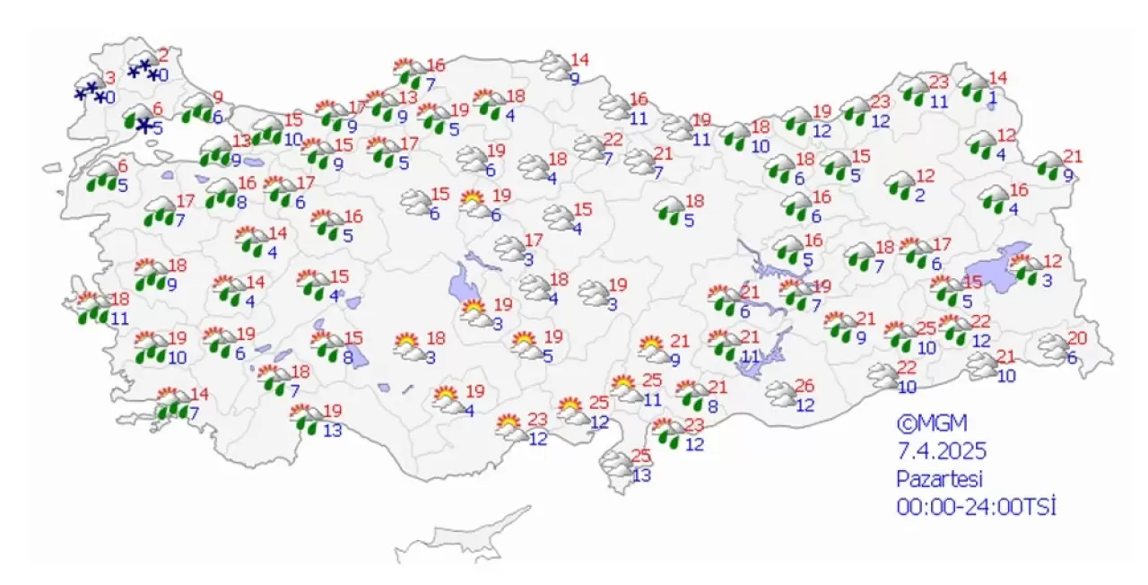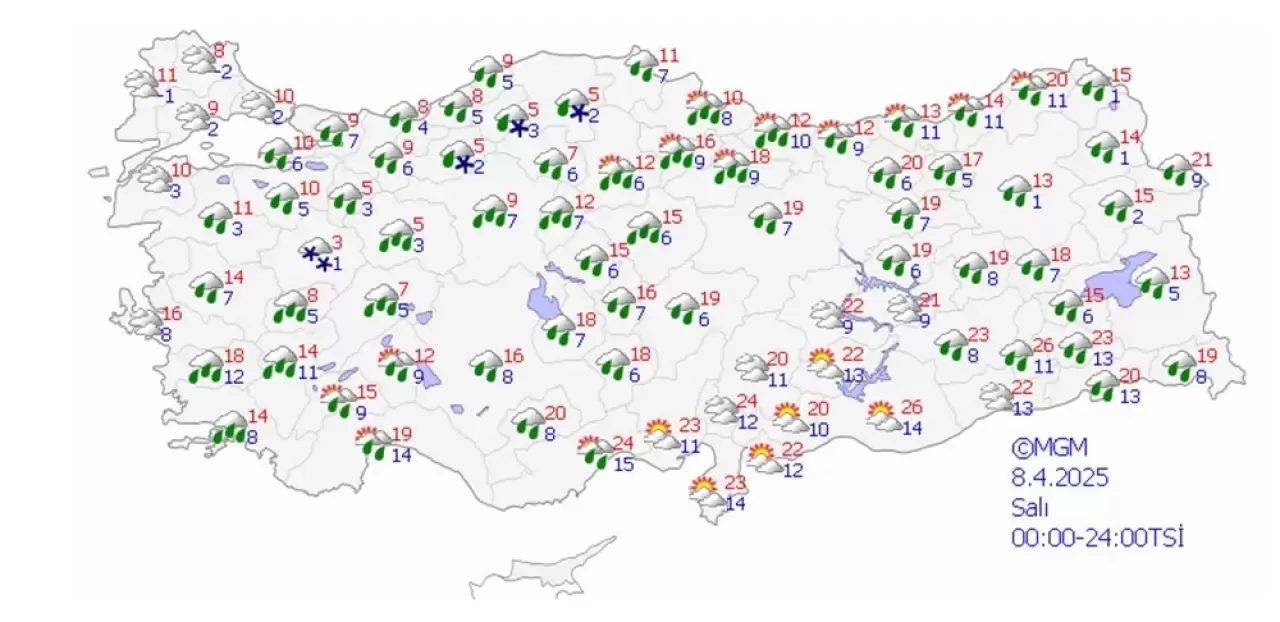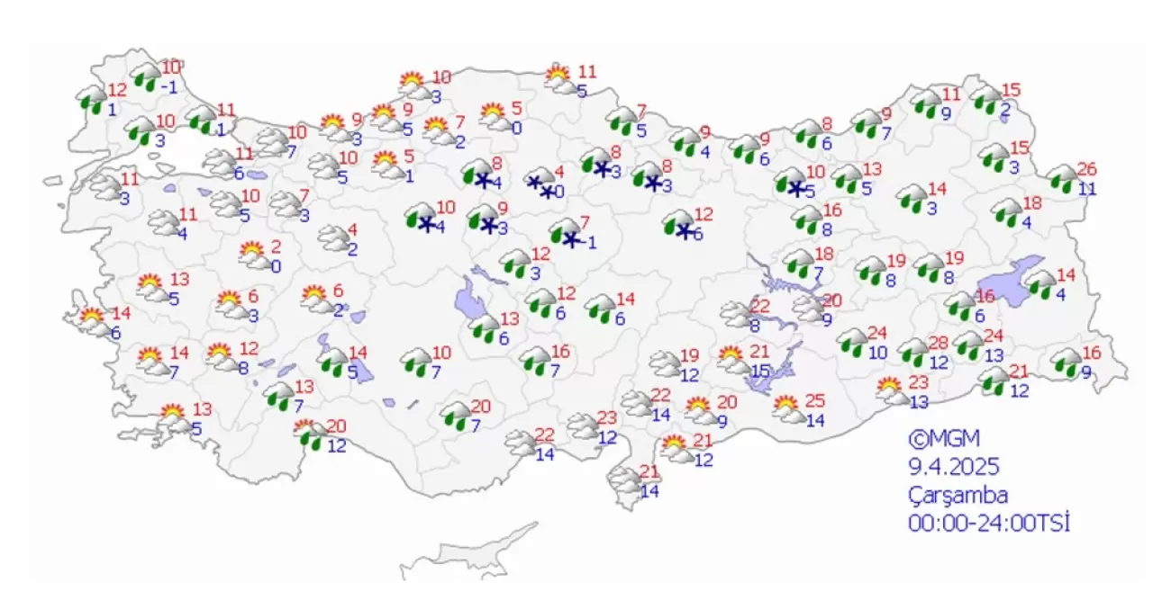 Meteoroloji Genel Müdürlüğü tarafından yapılan tahminlere göre, yurdun genelinin parçalı ve çok bulutlu, Iğdır, Van ve Hakkâri çevreleri hariç yurt genelinin yağışlı geçeceği tahmin ediliyor.