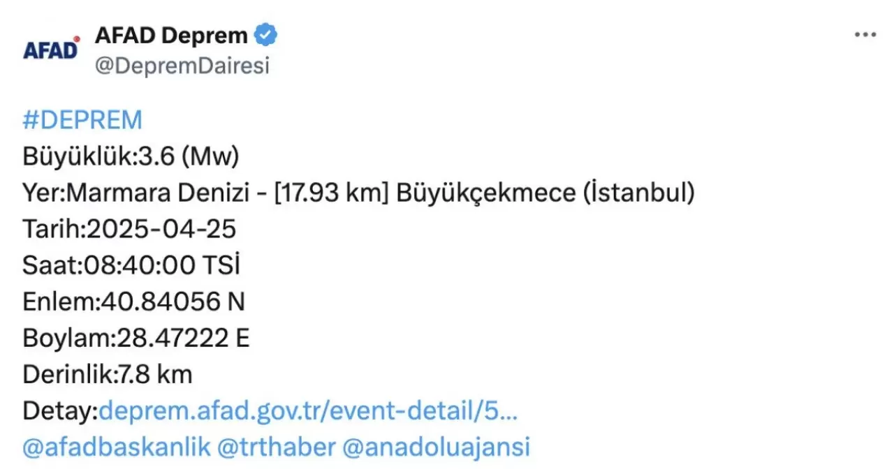 İstanbul'da saat 08.40 sıralarında hissedilen bir deprem daha meydana geldi...