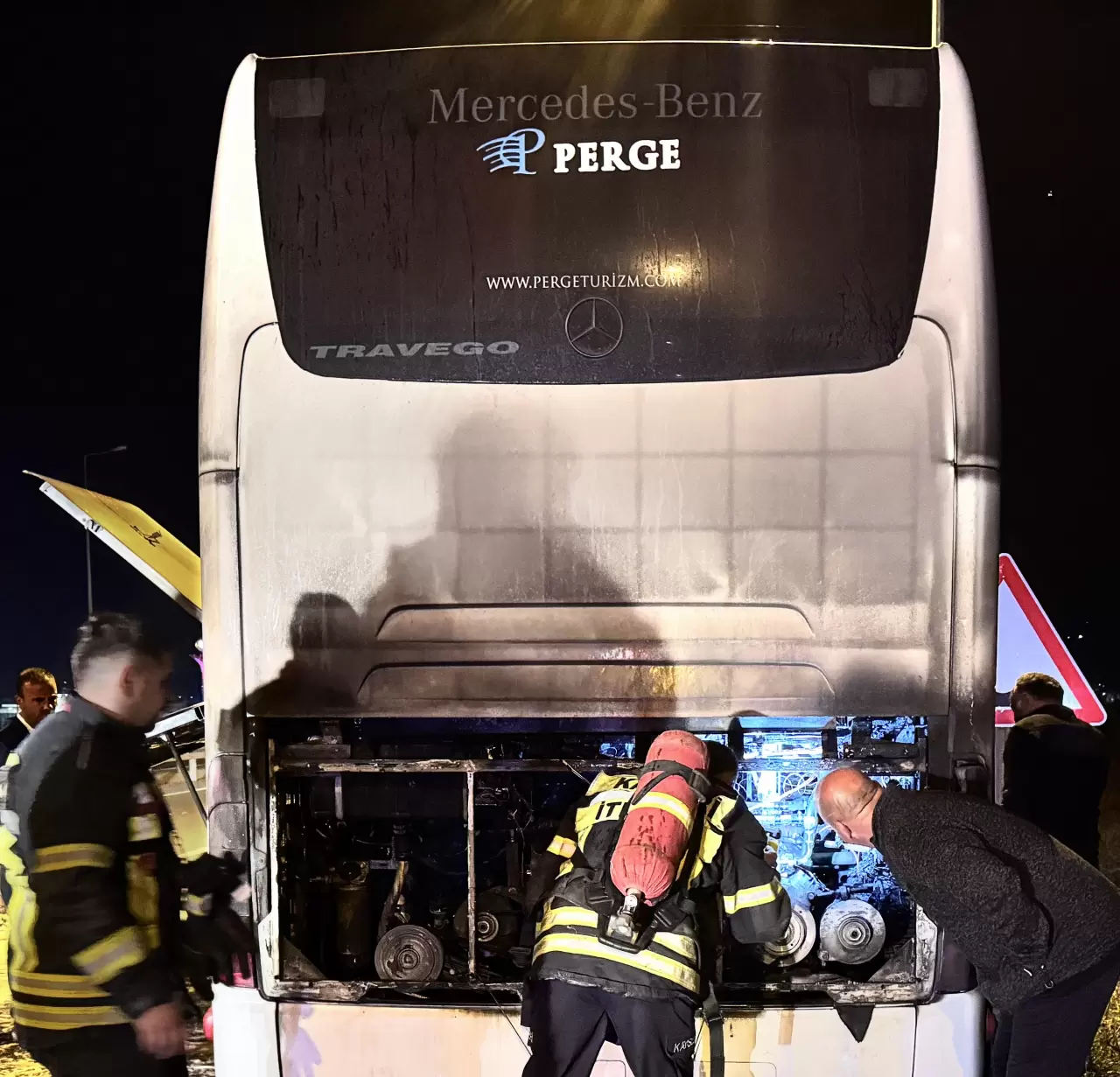Yangını fark eden sürücü, olası bir facianın önüne geçebilmek için aracı hemen emniyet şeridine çekerek içerideki yolcuları hızla tahliye etti.