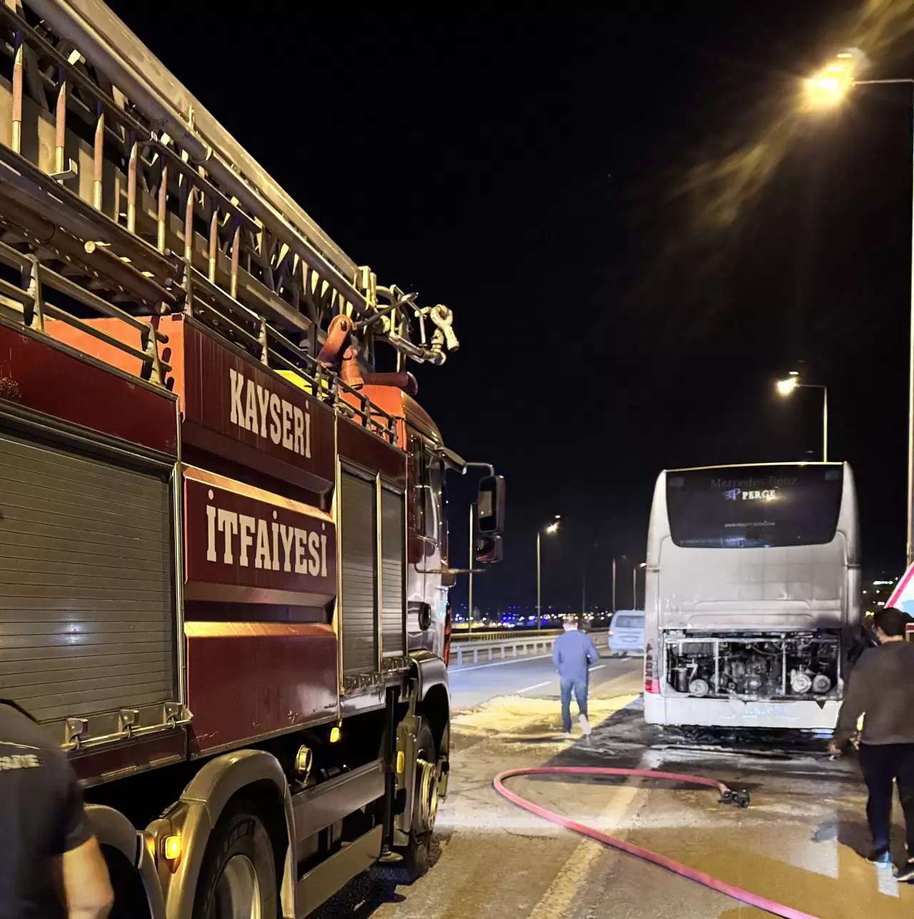 Kayseri'nin Kocasinan ilçesinde, turistleri taşıyan bir yolcu otobüsünde seyir halindeyken çıkan yangın paniğe neden oldu. Otobüs, kısa sürede alevlere teslim olurken can kaybı yaşanmaması sevindirdi.