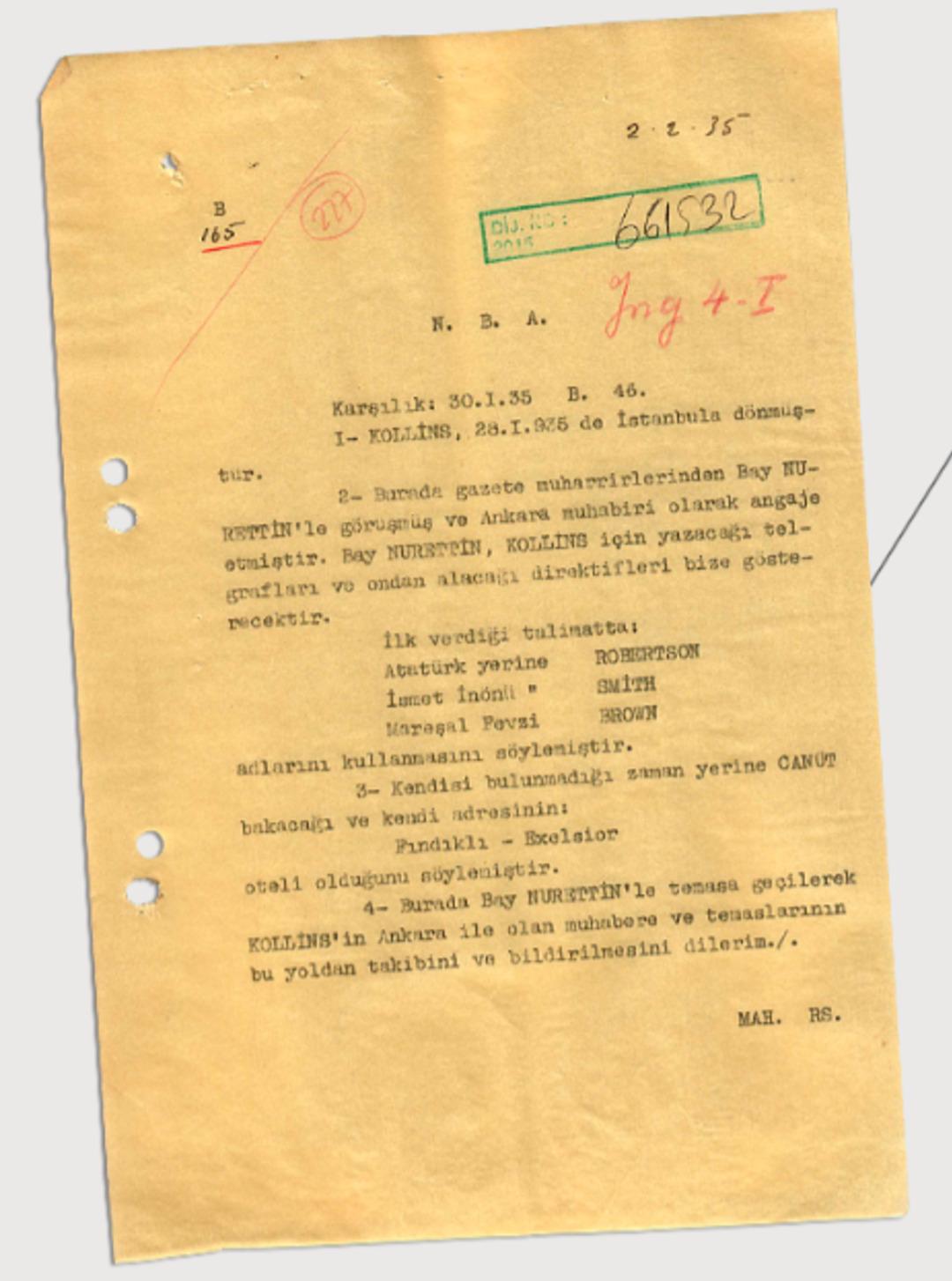 Raporda, Collins’in Atatürk ve dönemin önemli isimleri ile ilgili kod adlarını kullandığına dair şaşırtıcı bir detay yer alıyor. İlk verdiği talimatlarda, Atatürk’ün yerine "Robertson", İsmet İnönü’nün yerine "Smith" ve Mareşal Fevzi Çakmak’ın yerine de "Brown" kod adlarının kullanılması gerektiği belirtiliyor. Bu, Atatürk ve dönemin önde gelen isimlerinin güvenliğini sağlamak amacıyla yürütülen istihbarat çalışmalarının bir parçası olarak görülüyor.