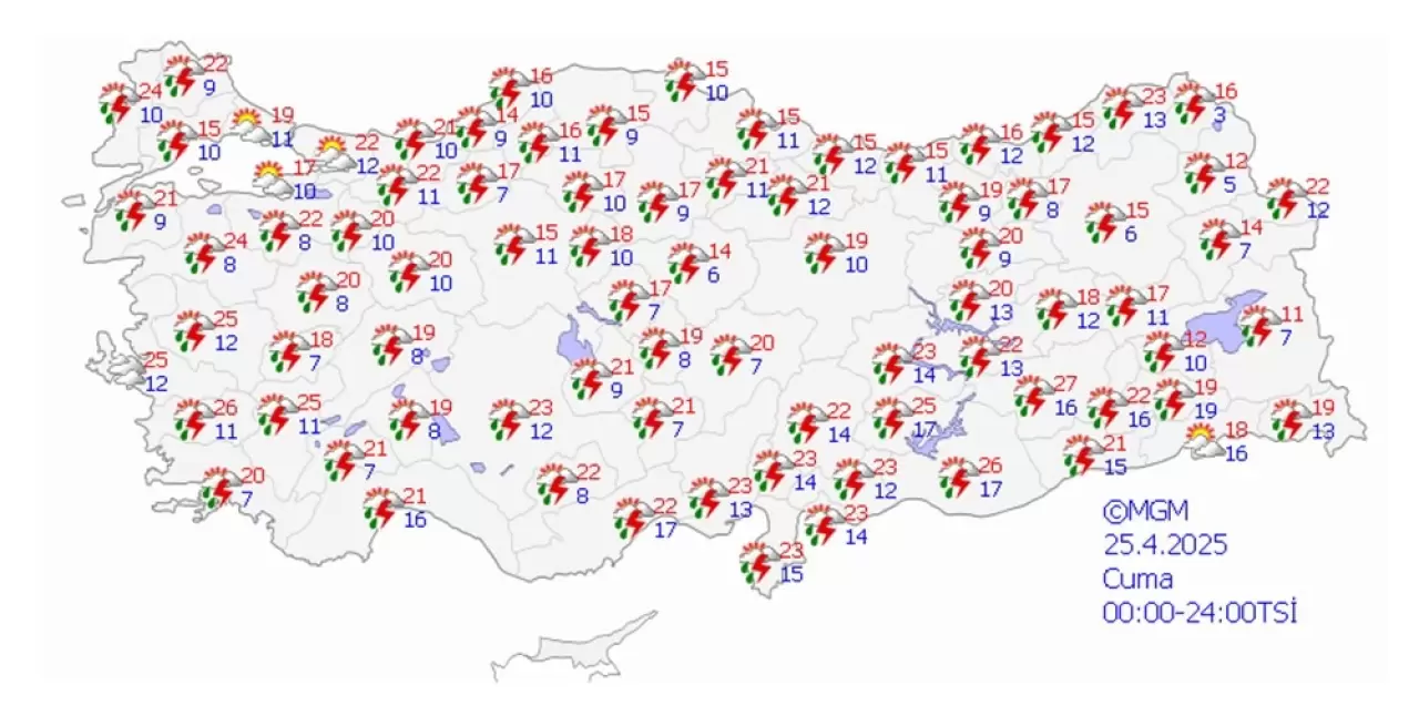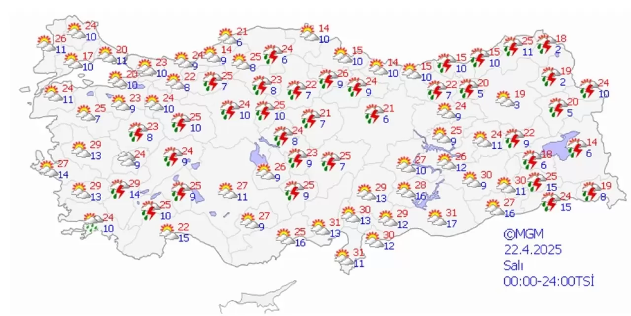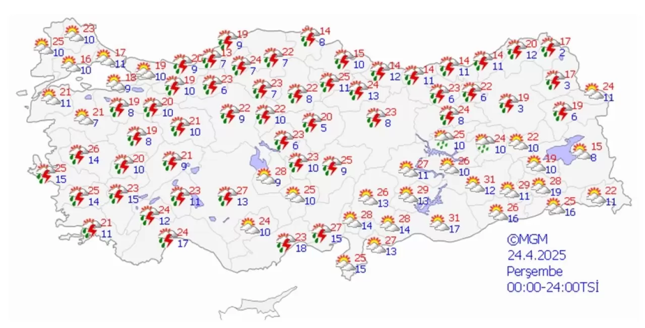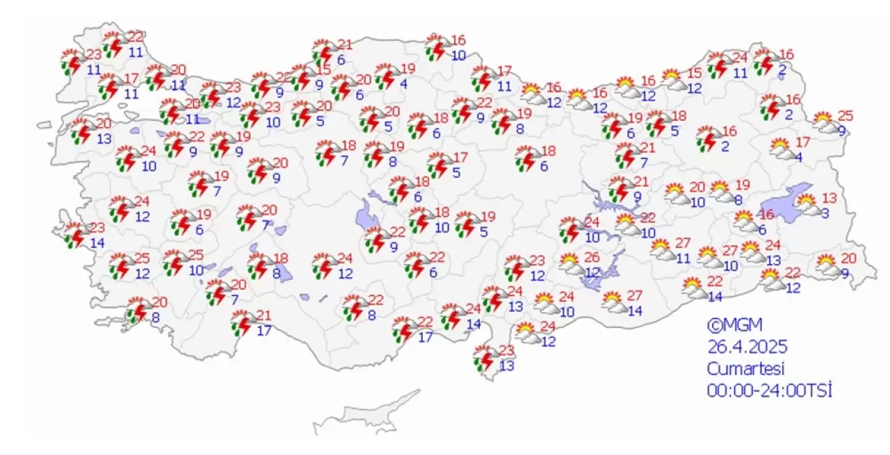 Meteoroloji Genel Müdürlüğü tarafından yapılan tahminlere göre; yurdun genelinin parçalı yer yer çok bulutlu, İç Ege, Göller Yöresi, İç Anadolu’nun kuzey ve doğusu, Karadeniz’in iç kesimleri, Doğu Anadolu’nun doğusu ile Muğla, Giresun ve Siirt çevreleri, Aydın'ın güney ilçeleri ve Antalya'nın batı kesimlerinin aralıklı sağanak ve gök gürültülü sağanak yağışlı geçeceği tahmin ediliyor.