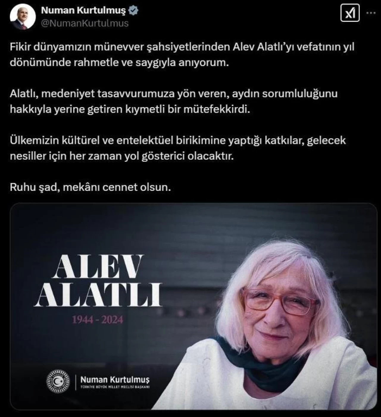 Kurtulmuş, sosyal medya hesabından paylaştığı mesajda, şu ifadeleri kullandı: "Fikir dünyamızın münevver şahsiyetlerinden Alev Alatlı'yı vefatının yıl dönümünde rahmetle ve saygıyla anıyorum. Alatlı, medeniyet tasavvurumuza yön veren, aydın sorumluluğunu hakkıyla yerine getiren kıymetli bir mütefekkirdi. Ülkemizin kültürel ve entelektüel birikimine yaptığı katkılar, gelecek nesiller için her zaman yol gösterici olacaktır. Ruhu şad, mekanı cennet olsun."