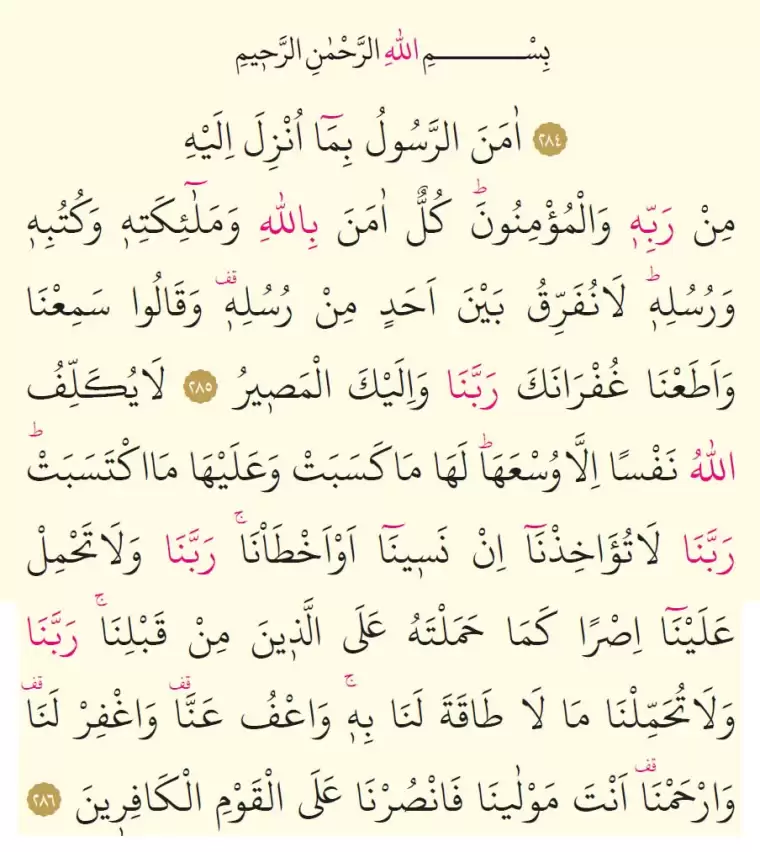 Lâ yükellifu(A)llâhu nefsen illâ vus'ahâ(c) lehâ mâ kesebet ve'aleyhâ me-ktesebet(k) rabbenâ lâ tu-âḣiżnâ in nesînâ ev aḣta/nâ(c) rabbenâ velâ tahmil 'aleynâ isran kemâ hameltehu 'ale-lleżîne min kablinâ(c) rabbenâ velâ tuhammilnâ mâ lâ tâkate lenâ bih(i)(s) va'fu 'annâ vaġfir lenâ verhamnâ(c) ente mevlânâ fensurnâ 'ale-lkavmi-lkâfirîn(e) (Bakara-286)