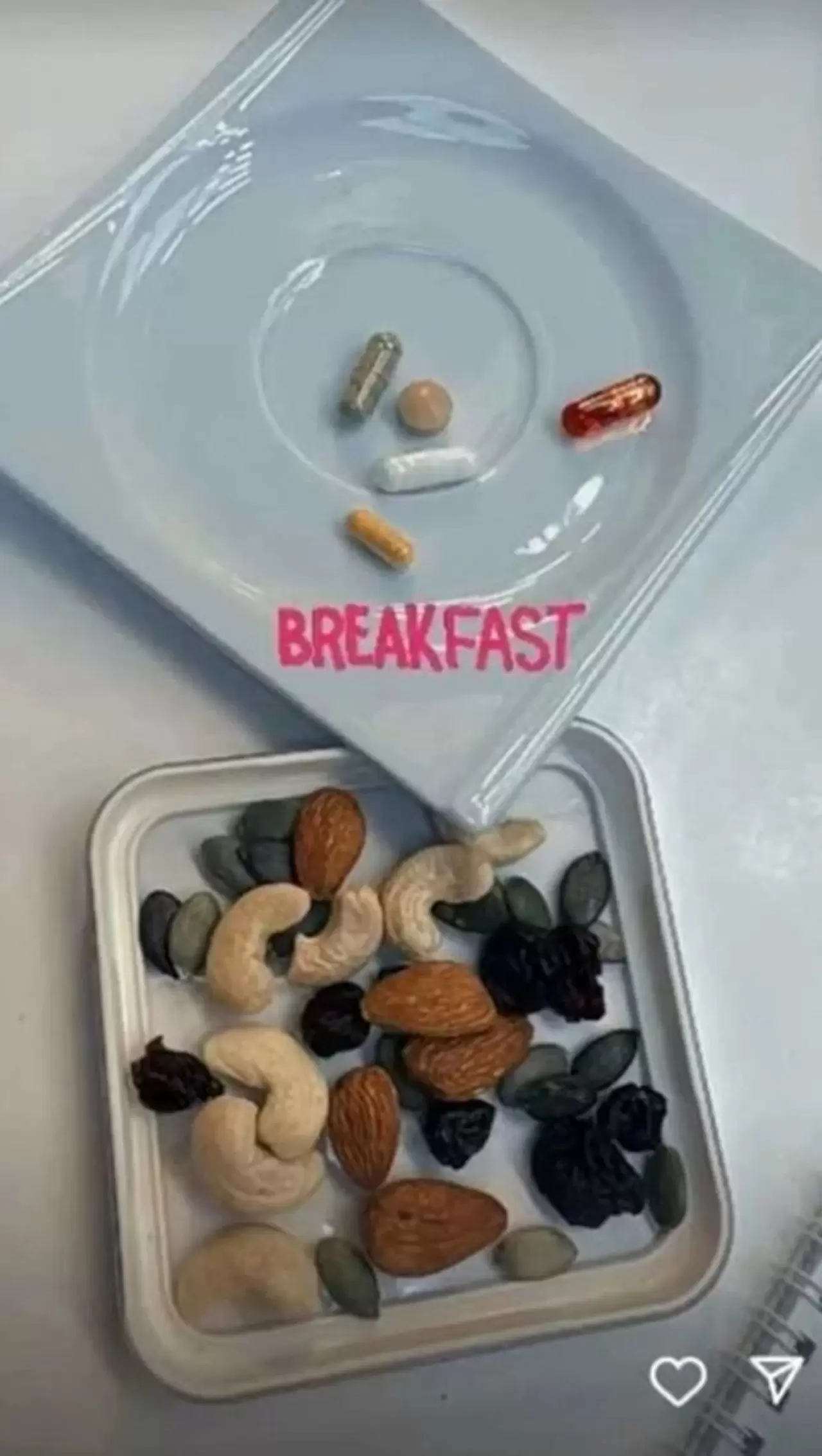 Şıkel'in paylaştığı kahvaltı tabağının kuruyemiş ve ilaçlardan oluşması ise herkesi şaşırttı.