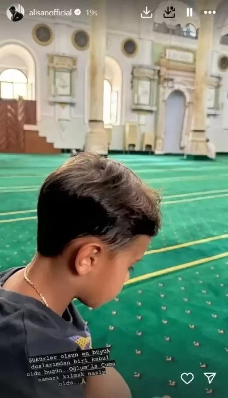 "Şükürler olsun en büyük dualarımdan biri kabul oldu" diyen Alişan 5 yaşındaki oğlu ile ilk cuma namazını kılmanın mutluluğunu yaşadı.