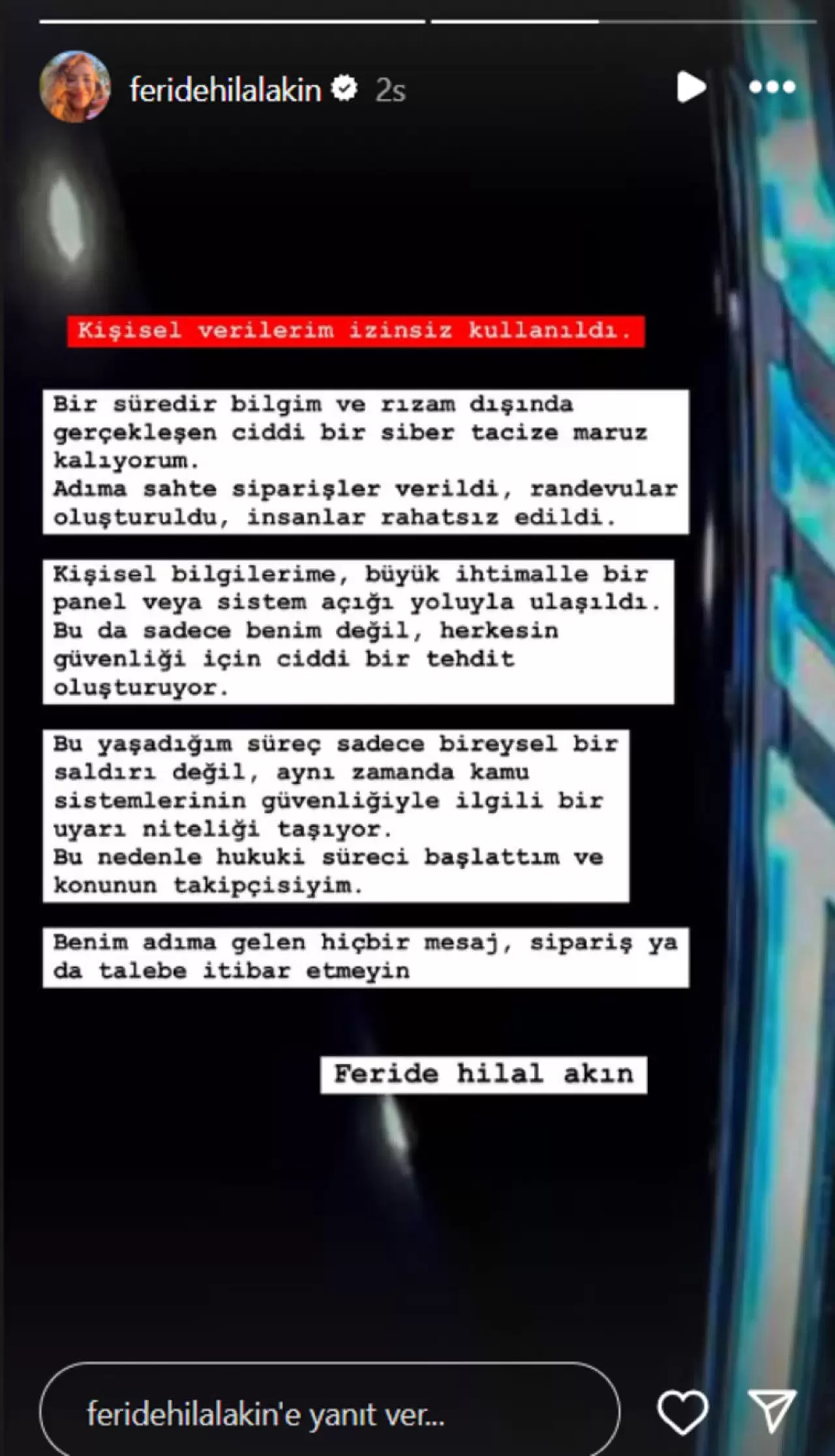 Feride Hilal Akın, sosyal medya hesabından yaptığı açıklamada, yaşadığı siber tacizi şu şekilde dile getirdi: “Bir süredir, bilgim ve iznim dışında ciddi bir siber tacize maruz kalıyorum. Adıma sahte siparişler verildi, randevular oluşturuldu, insanlar rahatsız edildi. Kişisel bilgilerime, büyük ihtimalle bir sistem açığı yoluyla ulaşıldı. Bu durum, sadece benim değil, herkesin güvenliği için ciddi bir tehdit oluşturuyor. Yaşadığım bu süreç, yalnızca bireysel bir saldırı değil, aynı zamanda kamu sistemlerinin güvenliğiyle ilgili bir uyarıdır.”