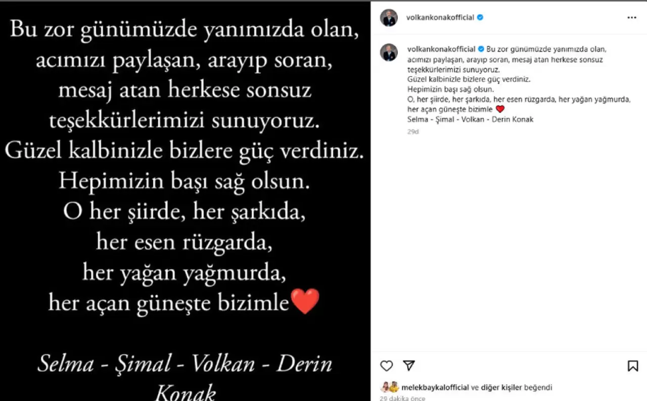 “Bu zor günümüzde yanımızda olan, acımızı paylaşan, arayıp soran, mesaj atan herkese sonsuz teşekkürlerimizi sunuyoruz. Güzel kalbinizle bizlere güç verdiniz. Hepimizin başı sağ olsun. O, her şiirde, her şarkıda, her esen rüzgarda, her yağan yağmurda, her açan güneşte bizimle.”