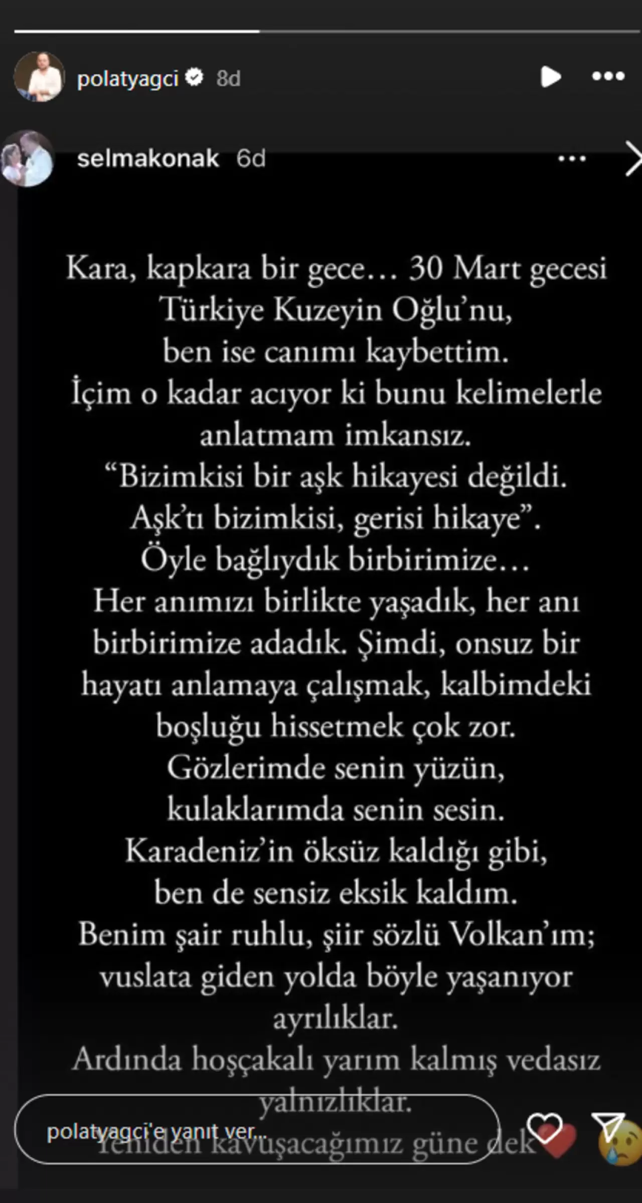 Benim şair ruhlu, şiir sözlü Volkan’ım; vuslata giden yolda böyle yaşanıyormuş ayrılıklar… Ardında hoşçakal, yarım kalmış vedasız yalnızlıklar… Yeniden kavuşacağımız güne dek.”
