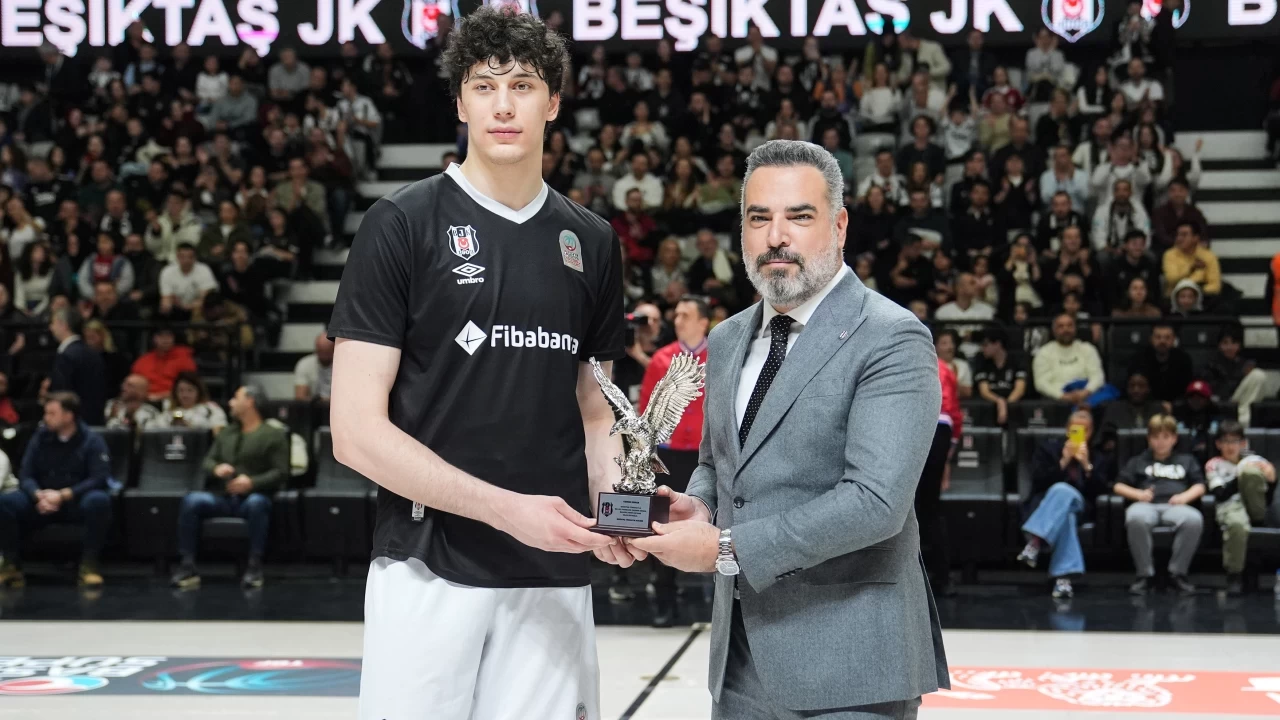 Beşiktaş Basketbol Şube Sorumlusu Özkan Arseven, siyah-beyazlı formayla 100. maçına çıkan Kerem Konan'a kartal heykeli ve 100 numaralı forma hediye etti.