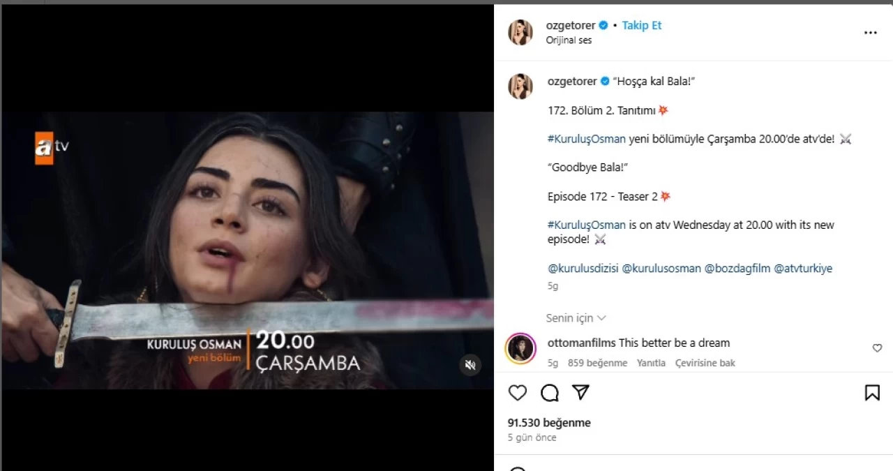 6 sezondur ATV'de ekrana gelen dizi Kuruluş Osman'da yeni bir ayrılık yaşanıyor. Bala Hatun'u oynayan oyuncu Özge Törer'in Kuruluş Osman'dan ayrılıyor. Oyuncu sosyal medya hesabından “Hoşça kal Bala!” notuyla paylaştı. Çarşamba akşamlarının sevilen dizisinde Özge Törer'in ayrılık haberi hayranlarda büyük bir üzüntü yaşatacak.