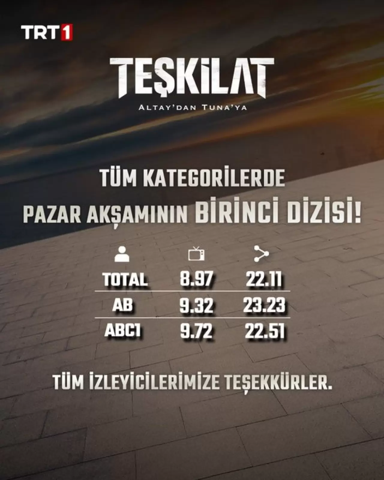 Teşkilat dizisi, 3 hedef kitle reytinglerinde zirvede yer alarak birinci oldu.