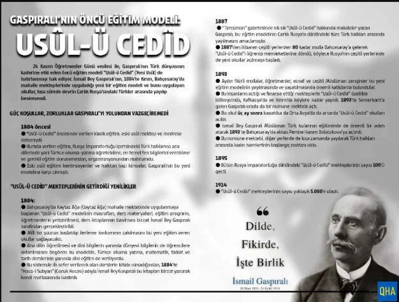 Tercüman gazetesiyle birlikte Gaspıralı’nın maarif reformu düşüncesinin en güzel örneği olan “Usûl-ü Cedîd” ve okulları, Türk modernleşmesine büyük katkı sağlamıştır. Modern eğitimin gereklerine uygun olarak dizayn edilen ve donatılan okullarda, Türkçe okuma-yazma öğretiminin yanısıra, temel aritmetik, hat, Kur’an okuma ve İslâm’ın esaslarını öğretmeye yönelik dersler yer almakta, buna bir üst basamakta genel coğrafya ve tarih, İslâm ve memleket tarihi hakkında giriş bilgileri ve tabiat bilgisi dersleri de ilâve olunmaktaydı. Karşılaştığı büyük engellere rağmen Gaspıralı’nın Usûl-ü Cedîd sistemi ve okulları, 1917 yılına kadar “Ceditçiler” olarak bilinen milli reformcuların yetiştirilmesine büyük katkı sağladı.