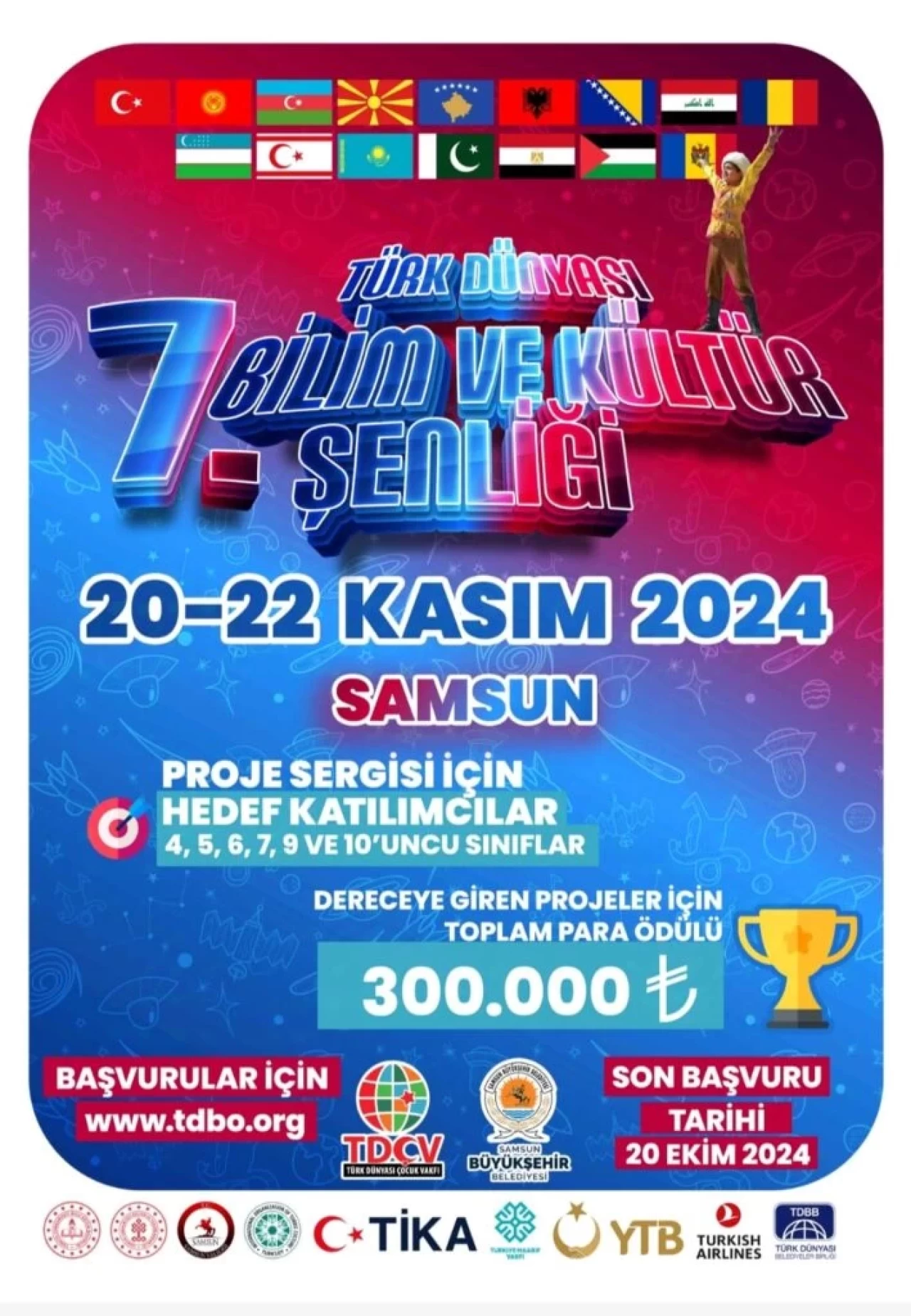 Türk Dünyası Çocuk Vakfı (TDÇV) tarafından bu yıl yedincisi düzenlenecek olan Türk Dünyası Bilim ve Kültür Şenliği, 20-22 Kasım 2024 tarihlerinde Samsun’da gerçekleştirilecek. Şenliğe, Türk cumhuriyetleri dahil olmak üzere 20’den fazla ülkeden genç mucitler katılacak.