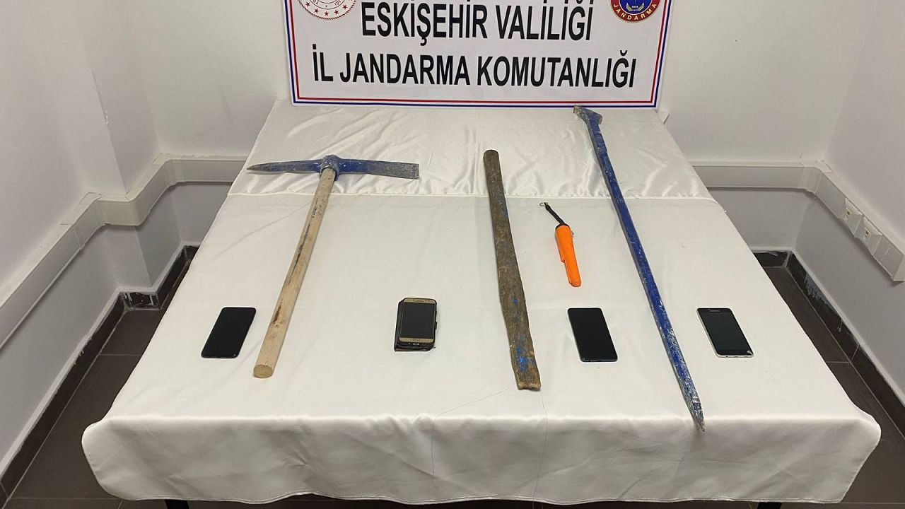 Kazı alanlarında 1 adet alan tarama cihazı, 1 adet yılan kamera, 6 adet el feneri, 2 parça halinde küp parçası, 4 adet bakır çubuk, 10 metre bakır tel, 1 adet el dedektörü cihazı, 1 adet kazma ve 2 adet hilti ele geçirilirken, 2 adet araç ile ekskavatör kepçe Alpu Yed-i Emin Otoparkı'na çektirildi. Eskişehir Cumhuriyet Başsavcılığı'nca şüpheliler hakkında ilgili kanun maddelerince soruşturma başlatıldığı öğrenildi.