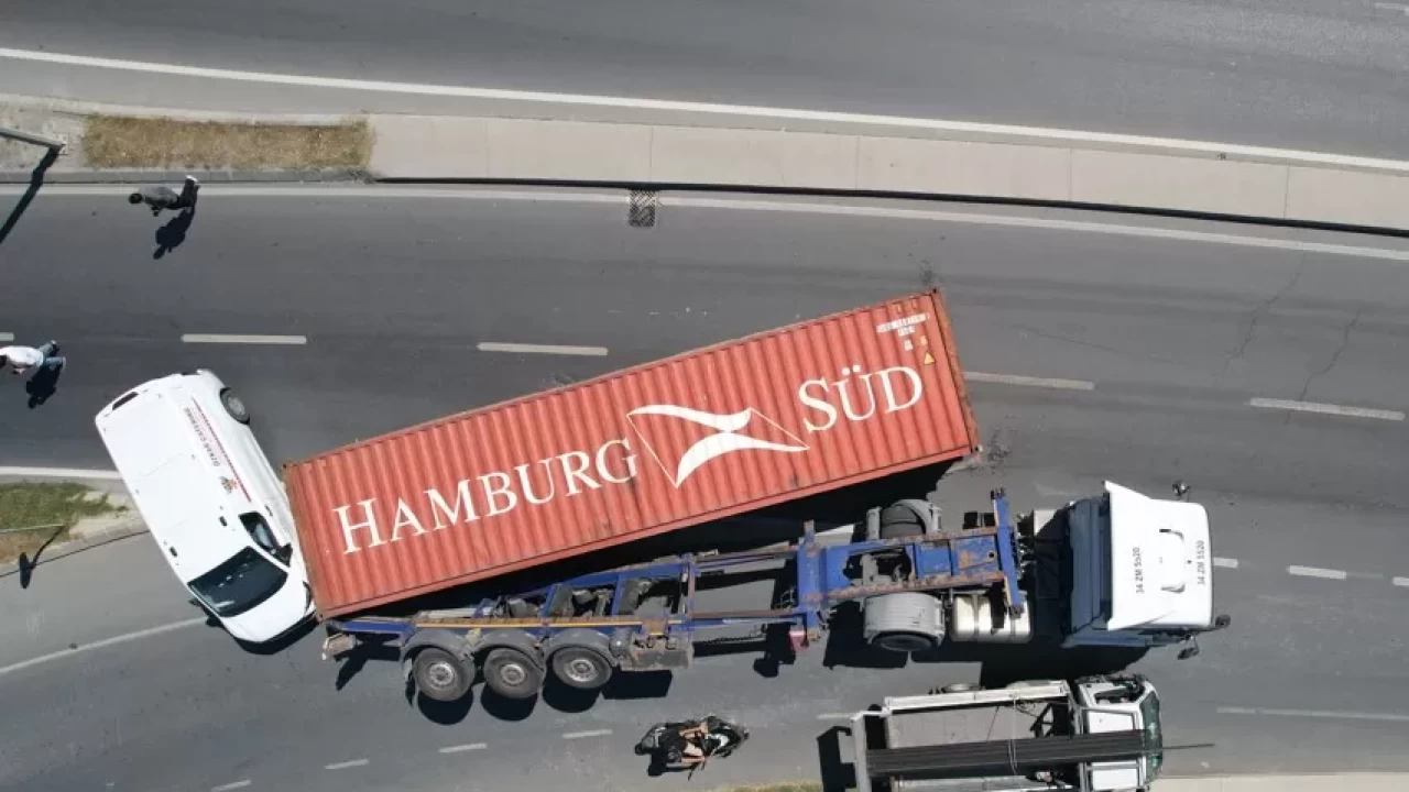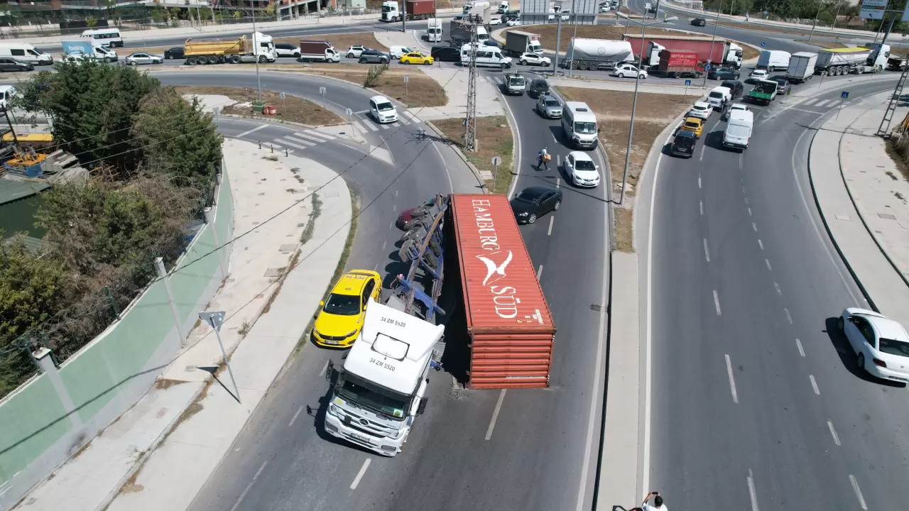 Güvenlik kamerasına yansıyan görüntülerde, kazadan saniyeler önce bir aracın konteynerin devrildiği şeritten geçtiği ardından tırın dönüş yaparken konteynerinin yola düştüğü görüldü. Kaza sonrası yol bir süre trafiğe kapatıldı. Polis ekipleri güvenlik önlemi alırken, devrilen konteyner havadan görüntülendi.