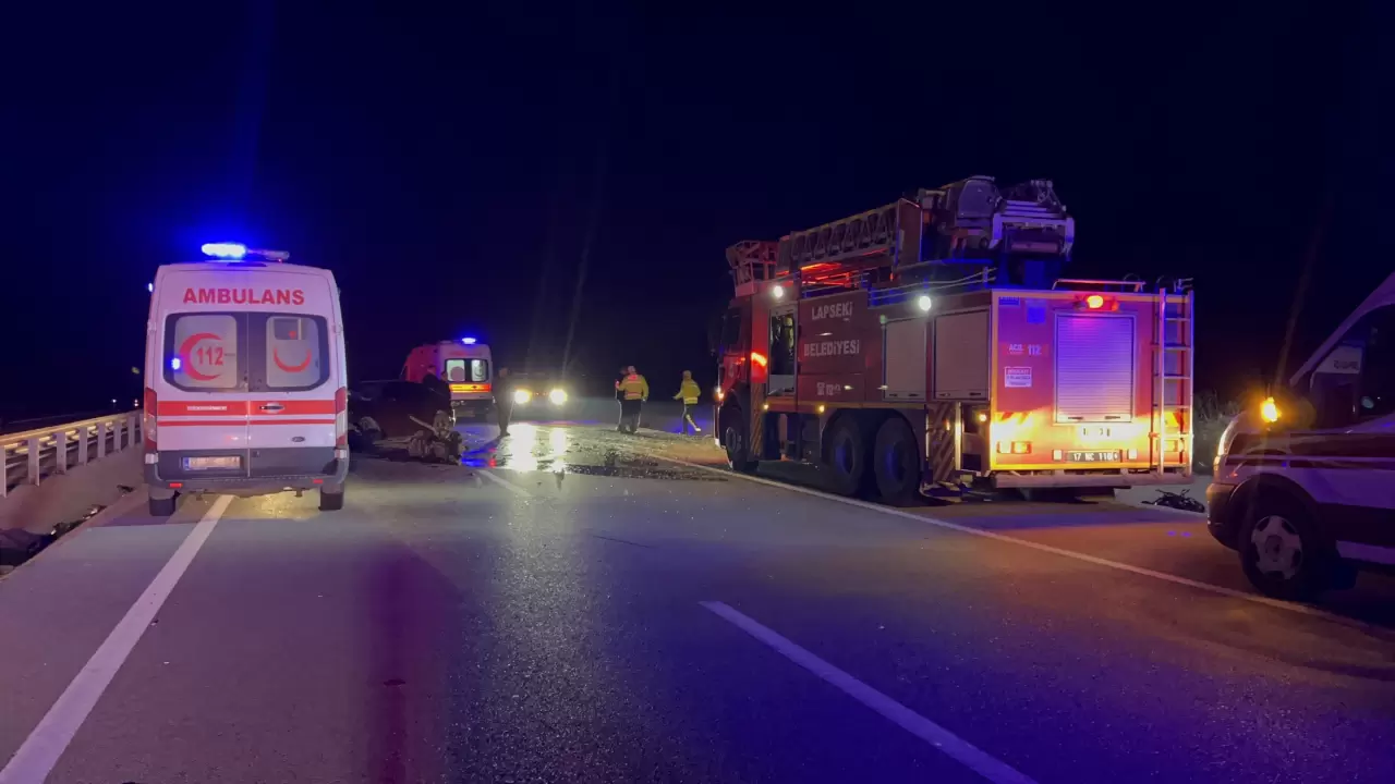 Kangırlı sapağı yakınlarında yaşanan kazada, ters yönde ilerleyen otomobil ile Lapseki istikametinden gelen araç kafa kafaya çarpıştı. Çevredeki sürücülerin ihbarı üzerine olay yerine çok sayıda sağlık ve itfaiye ekibi sevk edildi.