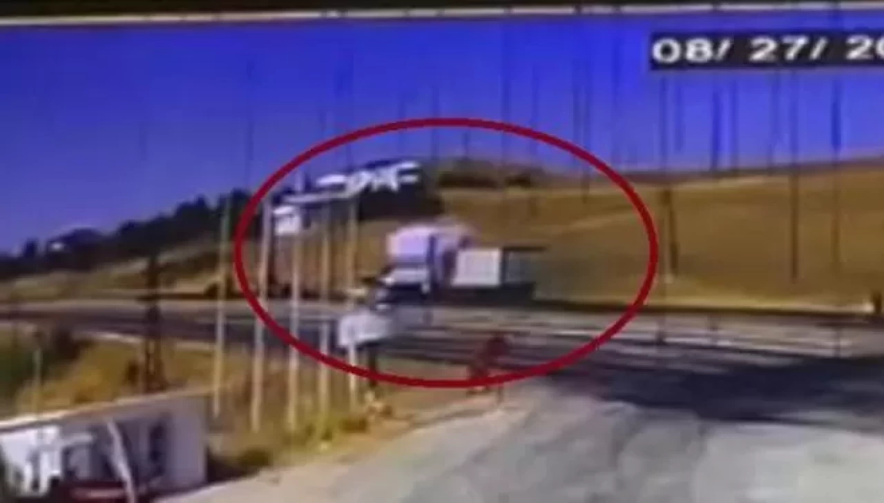 Görüntülerde, saman yüklü kamyonun sürücüsü, yok kontrolünü yaptıktan sonra gideceği güzergahın şeridine girdiği, ilerledikten sonra tırın arkadan gelip kamyona çarptığı anlar yer aldı.