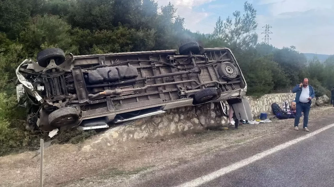 Aydın'ın Kuşadası ilçesinden Alman turistleri İzmir'deki Adnan Menderes Havalimanı'na götürmek için yola çıkan G.Ç. (53) yönetimindeki 09 AGN 162 plakalı minibüs, Menderes-Gümüldür kara yolunda devrildi.
