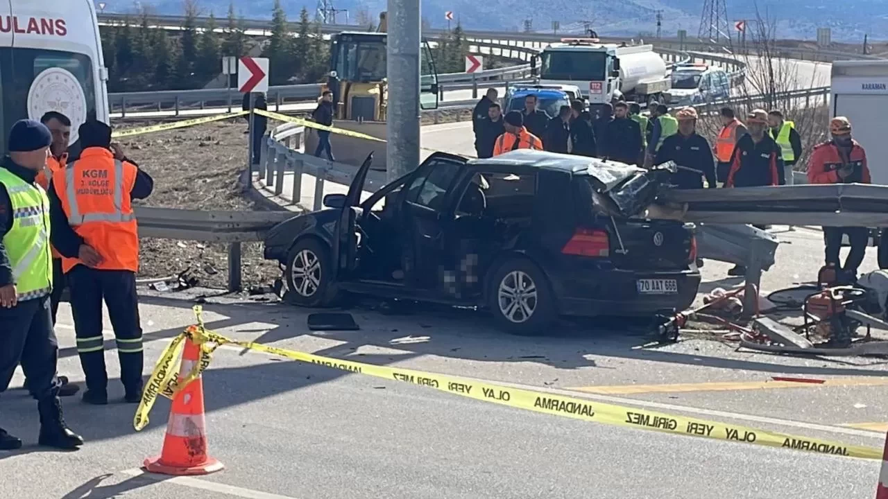 Karaman-Konya karayolunda meydana gelen trafik kazasında, sürücüsünün direksiyon hakimiyetini kaybettiği otomobil bariyerlere saplandı. Feci kazada karı koca yaşamını yitirirken, küçük kızları hastaneye kaldırıldı.