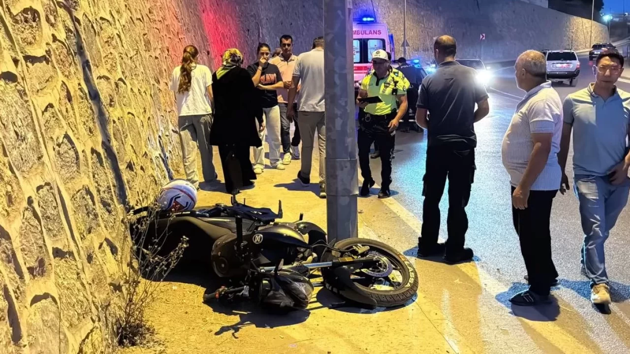 Devrilip yaklaşık 10 metre sürüklenen motosiklet, aydınlatma direğine çarparak durabildi.