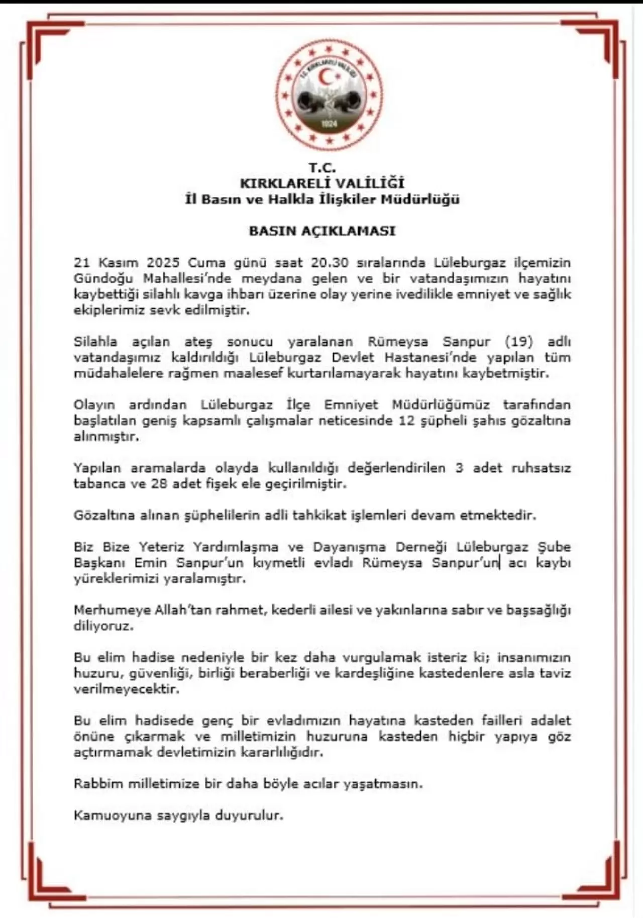 Kırklareli Valiliği, Lüleburgaz’da Rümeysa Sanpur’un nişanlısının evine yapılan silahlı saldırıda yaşamını yitirmesiyle ilgili açıklama yayımladı. Açıklamada, saldırı sırasında silahla vurulan 19 yaşındaki Rümeysa Sanpur’un kaldırıldığı Lüleburgaz Devlet Hastanesi’nde tüm müdahalelere rağmen kurtarılamadığı belirtildi.