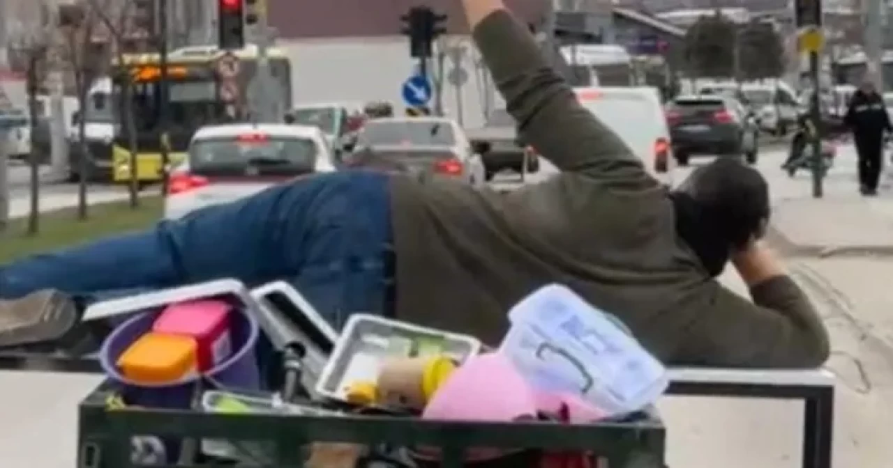 Olay, Osmangazi ilçesine bağlı Küçükbalıklı Mahallesi'nde 16 BMN plakalı kasalı motosikletin kasa kısmına yerleştirilen masanın üzerine uzanarak yolculuk yapan bir adam, trafikteki diğer sürücülerin dikkatini çekti. Yattığı yerden çevredeki araçlara el sallayan şahıs, görenleri hem güldürdü hem de düşündürdü.