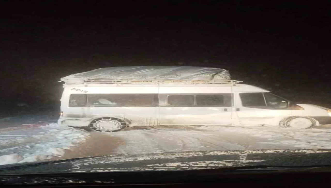 Siirt’in Pervari ilçesine bağlı Cemikere Yaylası’nda kar yağışı ve tipi nedeniyle ulaşım durma noktasına geldi. Olumsuz hava koşulları sebebiyle bir yolcu minibüsü ile bir pikap yolda mahsur kaldı.
