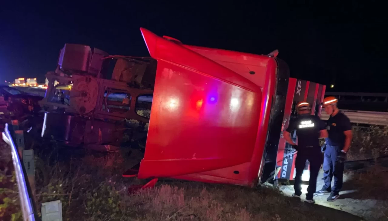 TEM Otoyolu'nda cip ile çarpışan tır orta refüje devrildi