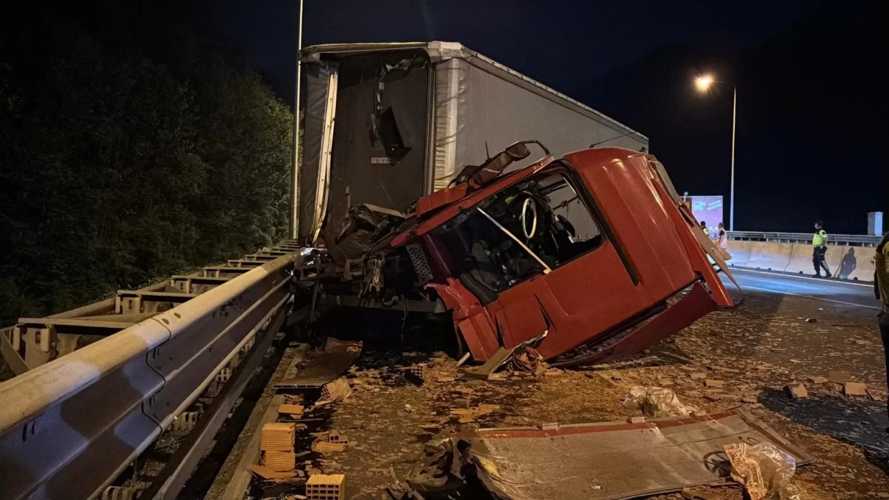 TEM Otoyolu’nun Bolu Dağı Tüneli çıkışında kontrolden çıkan bir tır, tuğla yüklü tıra çarptı. Çarpmanın etkisiyle hurdaya dönen tırdan, sürücü burnu bile kanamadan kurtuldu. Yola dökülen tuğlalar sebebiyle otoyolun İstanbul istikameti tek şeritten kontrollü olarak sağlandı.