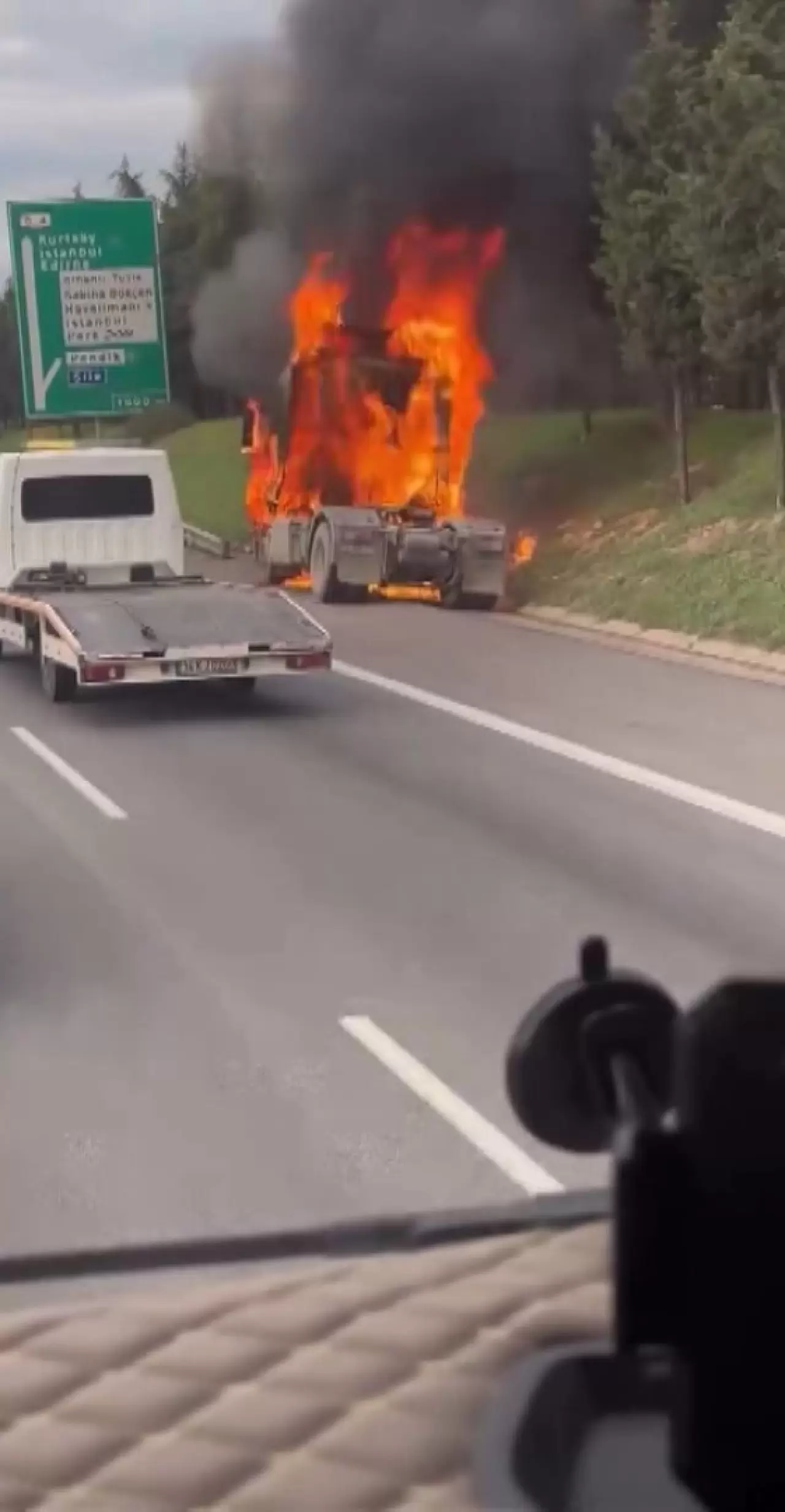 Yangın nedeniyle otoyolda trafik bir süre iki şeritten kontrollü olarak sağlandı. TIR’ın alevler içinde kaldığı anlar, çevredeki vatandaşlar tarafından cep telefonu kamerasıyla kaydedildi.