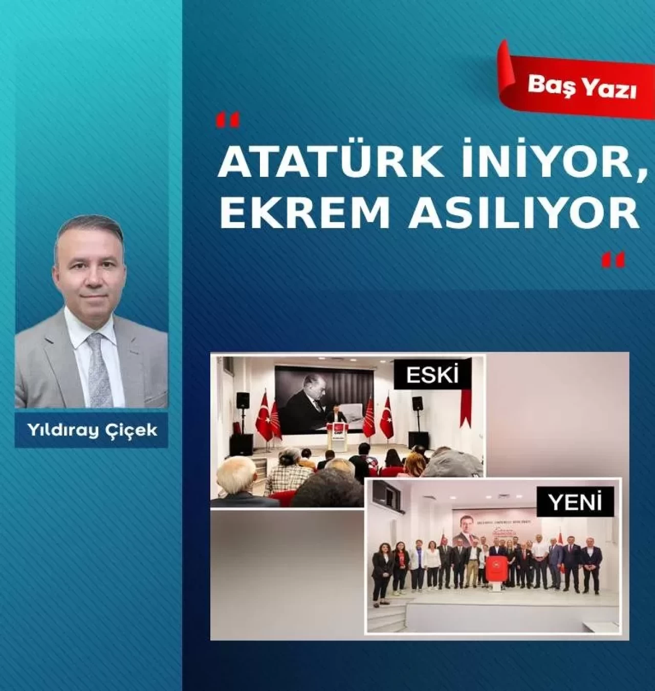 Bugün CHP binalarında Atatürk’ün fotoğrafları indiriliyor ve “Bana bakan, Mustafa Kemal Atatürk’ü görür” diyerek şizofrenik bir tutum sergileyenin fotoğrafları asılıyor.