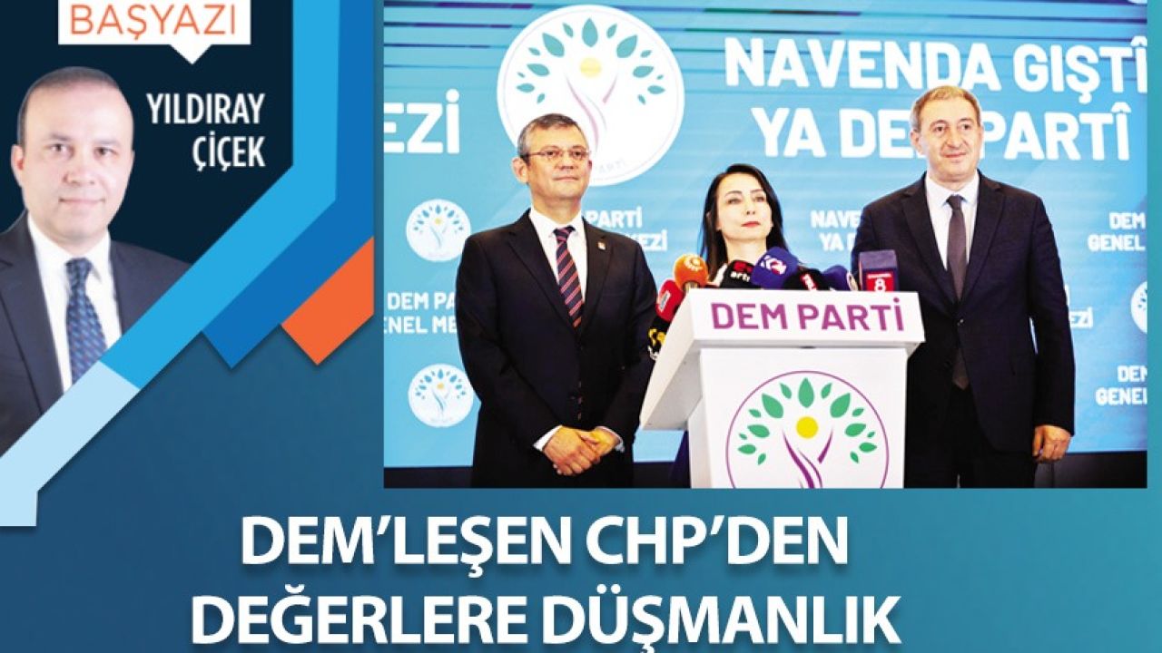 Mesele sadece susması ve siyasi işbirliği yapması değil, artık bildiğiniz ortada bir “benzeşme” var. CHP-DEM, Türk-İslam değerlerine düşmanlıkta birbiriyle adeta bir yarış halinde… PKK DEM’liği; Türk bayrağına, İstiklal Marşına ve şehitlerimize düşmanlık yapıyor da CHP yapmıyor mu?